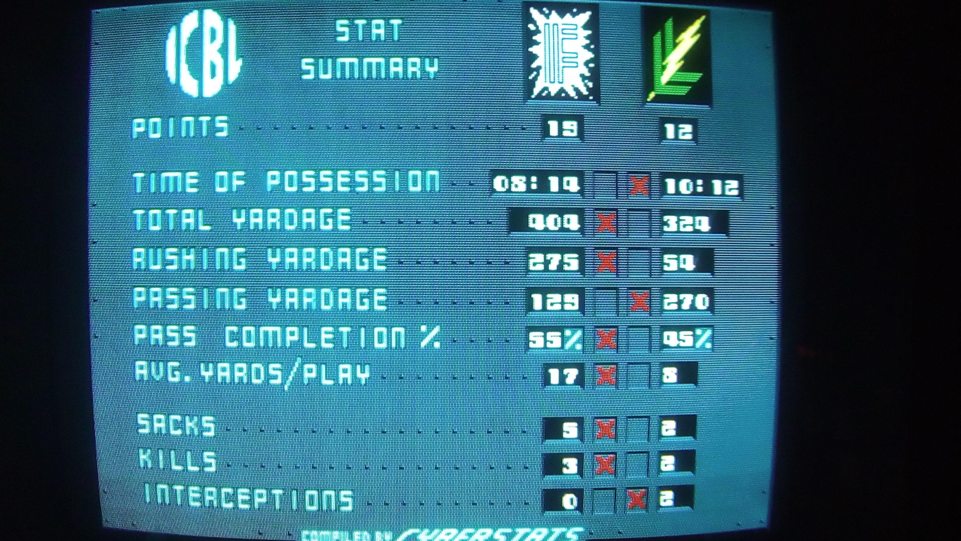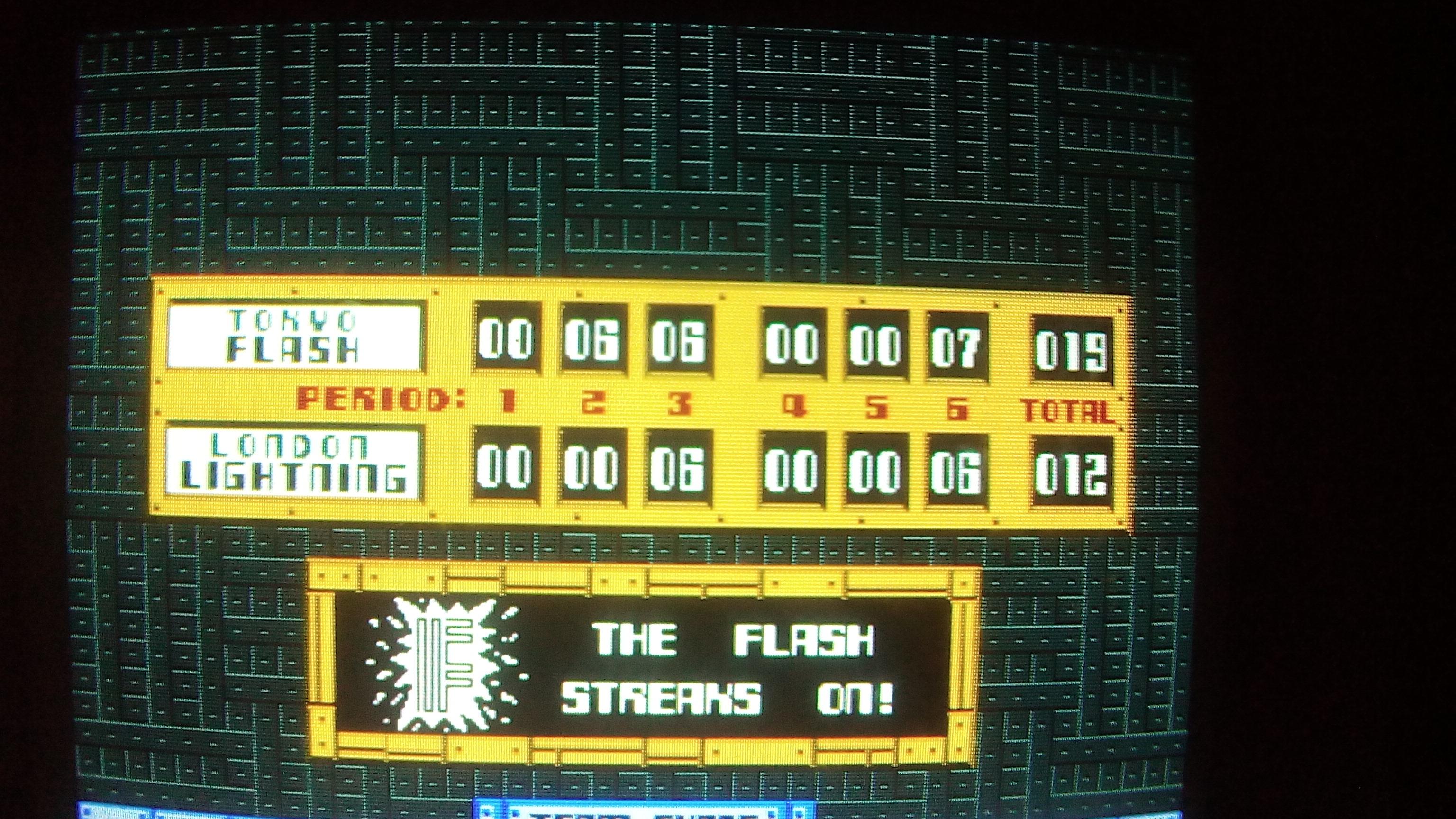 I did get in a game of (one-player) Tournament Cyberball before the night was over; I’ve done better, but knowing I can win games that come down to the wire like this one is a great confidence booster. I don’t know how much I’m going to practice this one to try to get back to where I once was (I used to be at least decent, if not good, at this particular title). It is a fun one to play between rounds of pinball, I’ll give it that. I have, in the past, stuck to the Flash as my team of choice. Back in the day I would play a lot of games as either the Crush or the Flash, though i have given thought to switching up to a passing team as my team of choice (either Lightning or Invasion).