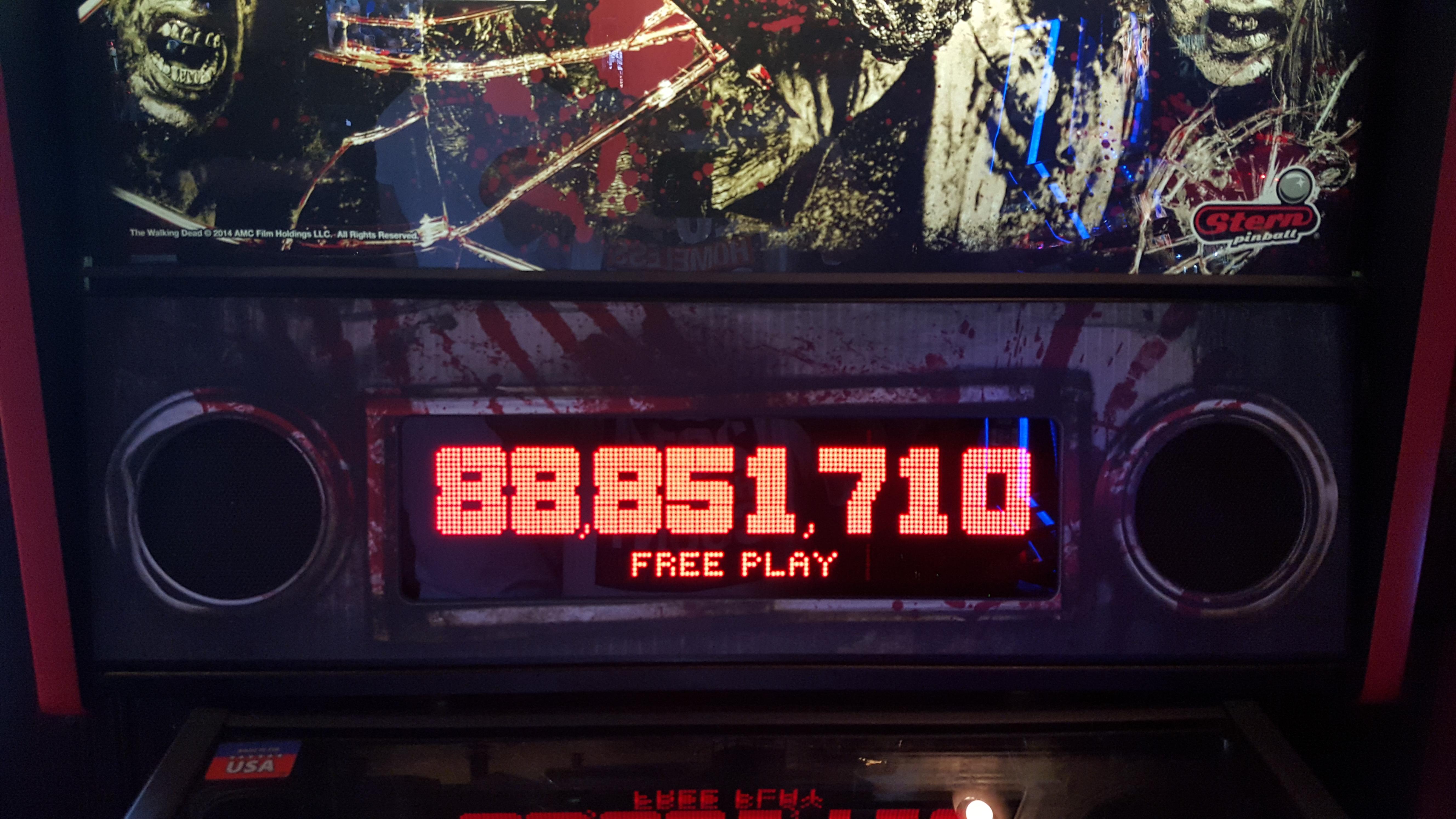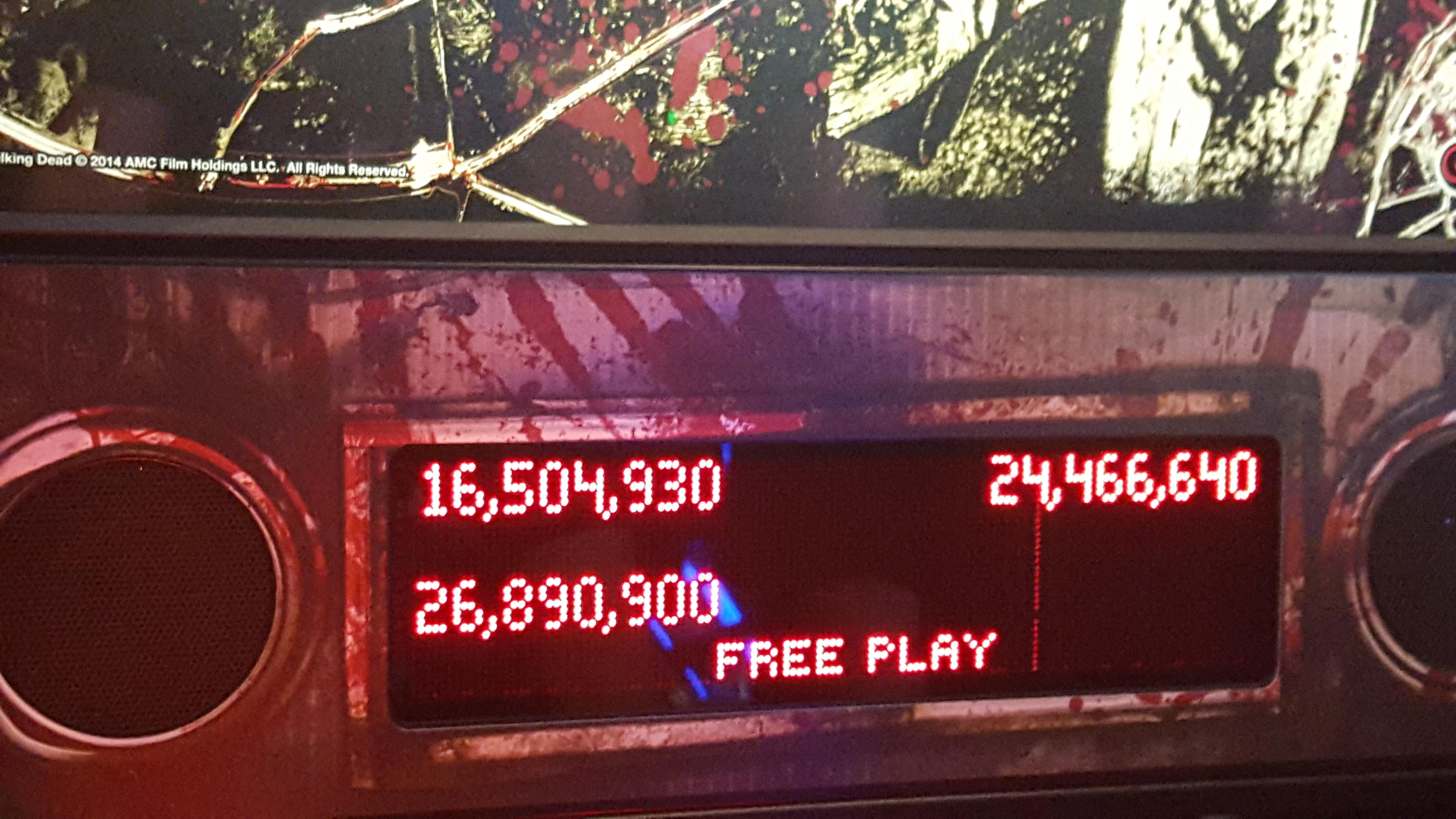 So things get off to a slow start given that we are waiting for a machine to open up for our first game. Luckily, The Walking Dead opens up relatively quickly. Rusty and David happen to blow it up with scores of 23,131,430 (first) and 23,049,360 (second). By some miracle I eek out third with 13.9M+ despite barely making the extra ball shot and (I think) not getting a multiball mode going at all.