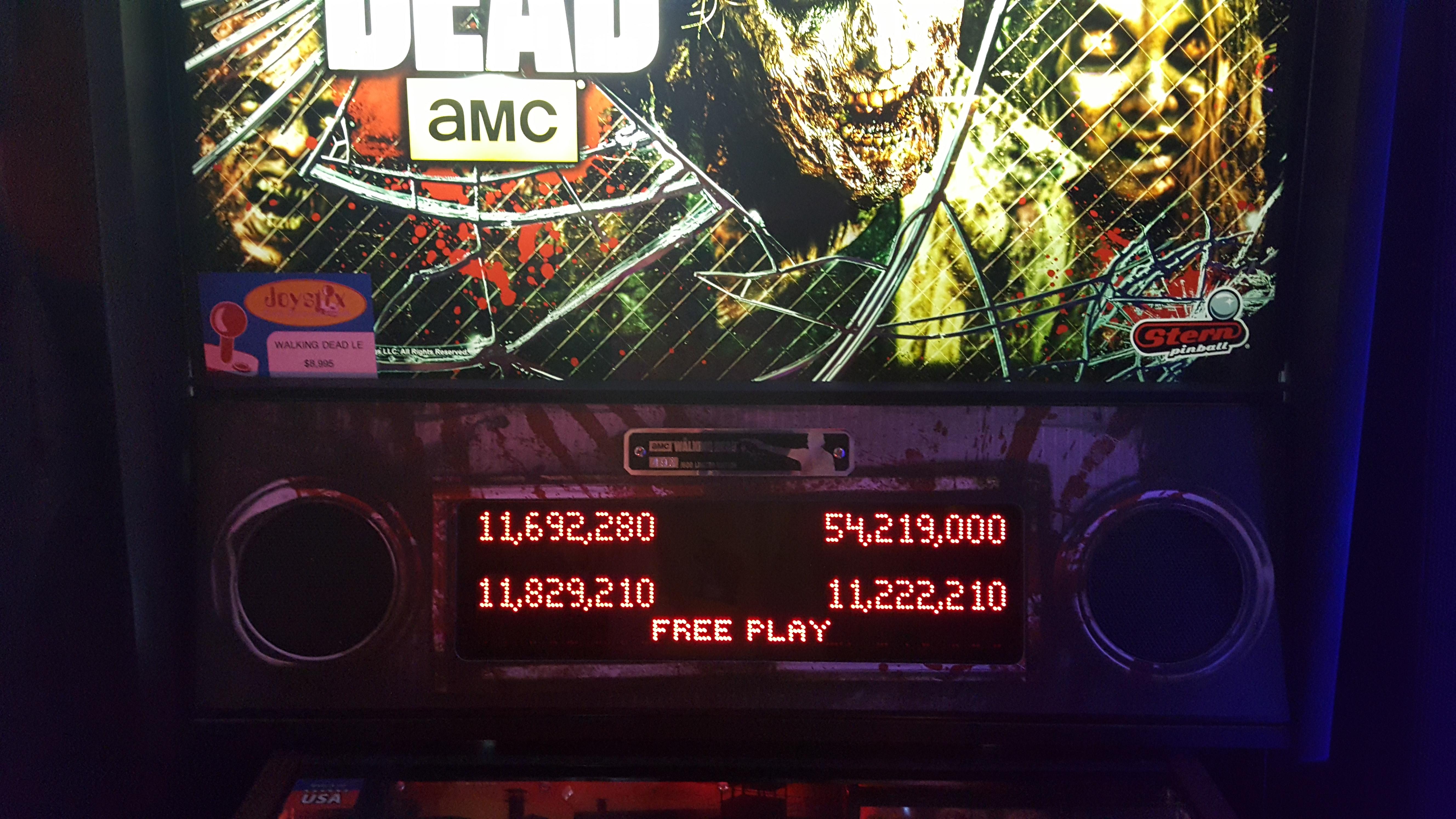 We would continue with a game on The Walking Dead. This wound up being a very close game except for William’s absolutely smashing performance of 54.2M+. I signed off with 11,692,280; Chris wrapped up with 11,222,210, but the real surprise was Carlos eeking out a second with 11,829,210. Exactly 607,000 points separating second and fourth place, and just under 137,000 separating my third place score from second place. The frustrating part is that I know I’m a better player than that score indicates; to add insult to injury, I whiffed on the lit extra ball at the end, which would have almost certainly given me enough to nail down second place.
