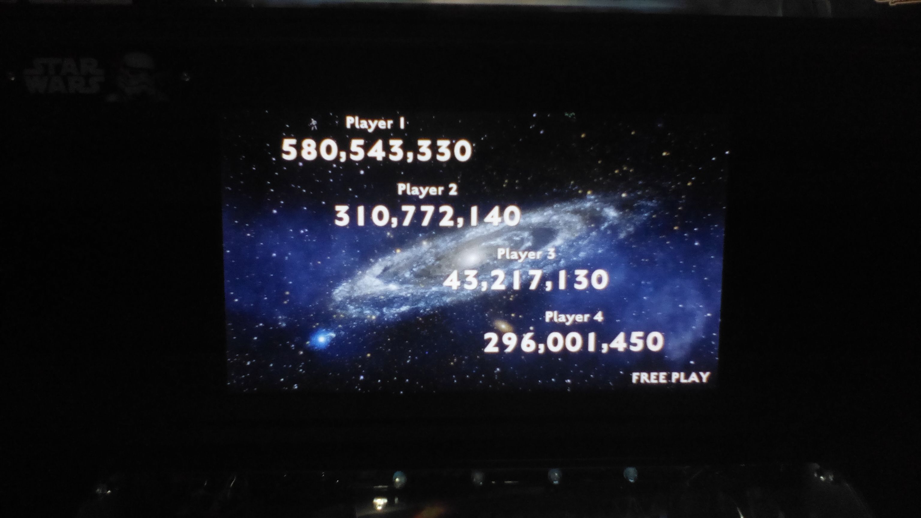 The next game would be Star Wars, and I would have the supposed advantage of playing fourth. My first ball was just crummy, with only 5.3M+. On this game, that’s almost nothing; by comparison, by the time action got back around to me, Matt had put up 533.1M+ and Dylan had put up 280.5M+. My second ball would go much better, putting me at least back within striking distance with 243.0M+. Matt and Dylan would have relative duds for a third ball, so I would only have to beat Dylan’s 310.7M+ for second and Matt’s 580.5M+ for first. Though I will admit the way my luck had been going, it wouldn’t be that big of a surprise for Matt to have put up over a billion. Anyway, I was only able to muster a 296.0M+ for a relatively close third place. That brings me up to eleven standings points on the night with one game remaining.