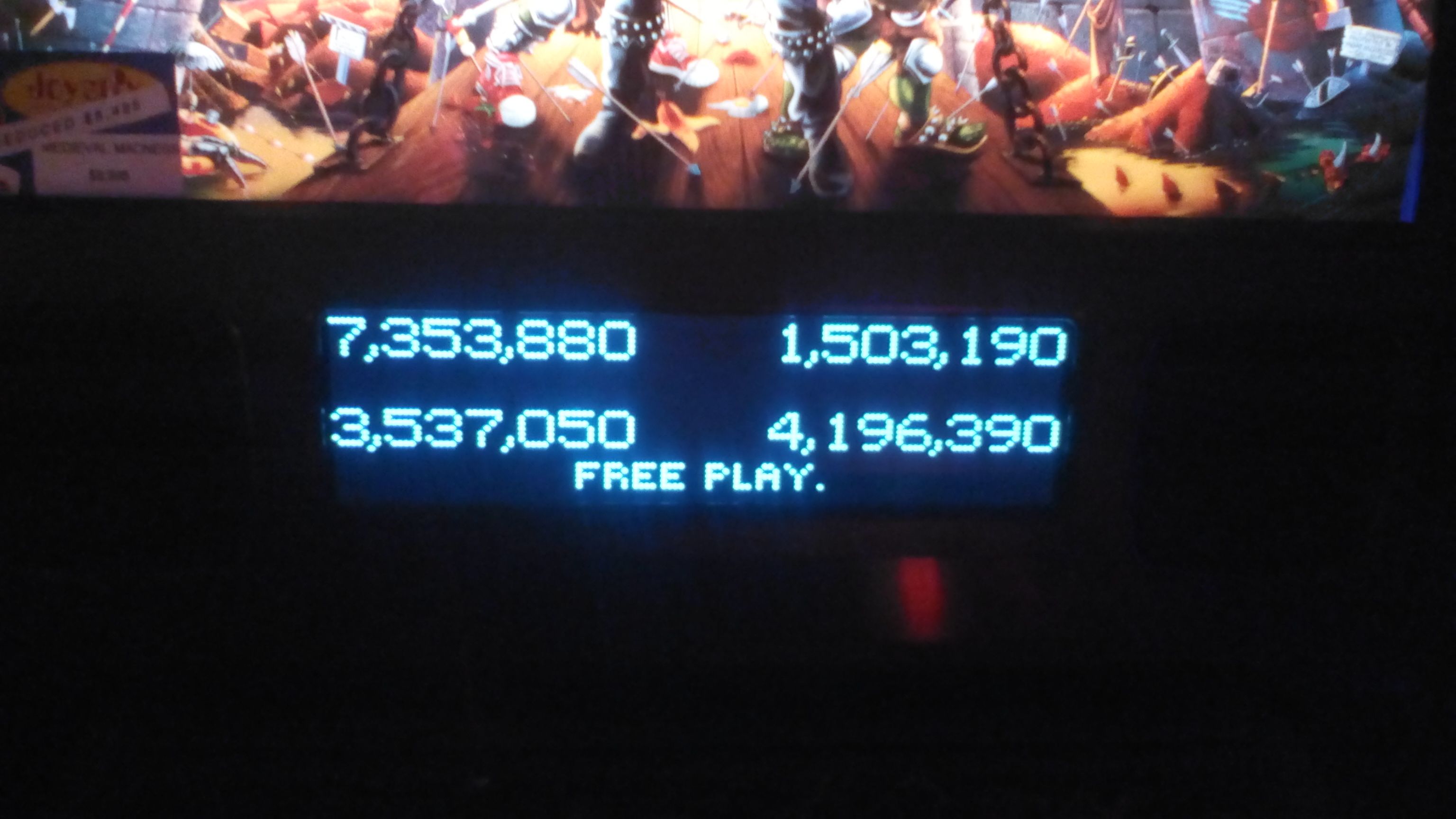The final game would be Medieval Madness, and again I would be going fourth (the way the Matchplay software works, one game has the same player order twice over the course of a night in a four-player group, as the order is simply rotated for each game in turn, though we rarely play the games in the order Matchplay lists them). Matt had the lead from the beginning, putting up 6.1M+ on his first ball. Amazingly, my first ball was a whopping dud with a princely total of 421,320–less than both Dylan’s and Drew’s first-ball scores of 540,190 and 677,630. I would do somewhat better on my second ball, getting to 1.51M+ but I would face scores of 7.35M+, 1.50M+, and 3.53M+ from Matt, Dylan, and Drew respectively by the time I started ball 3. Right away, I was able to hit the castle shot to score a destroyed castle for 2M, and combined with a few other miscellaneous shots I would muster up enough points to sign off with 4.19M+, enough for second place and bringing me up to fourteen standings points on the night. Not exactly the most ambitious performance if I want to keep my first place in the overall standings.