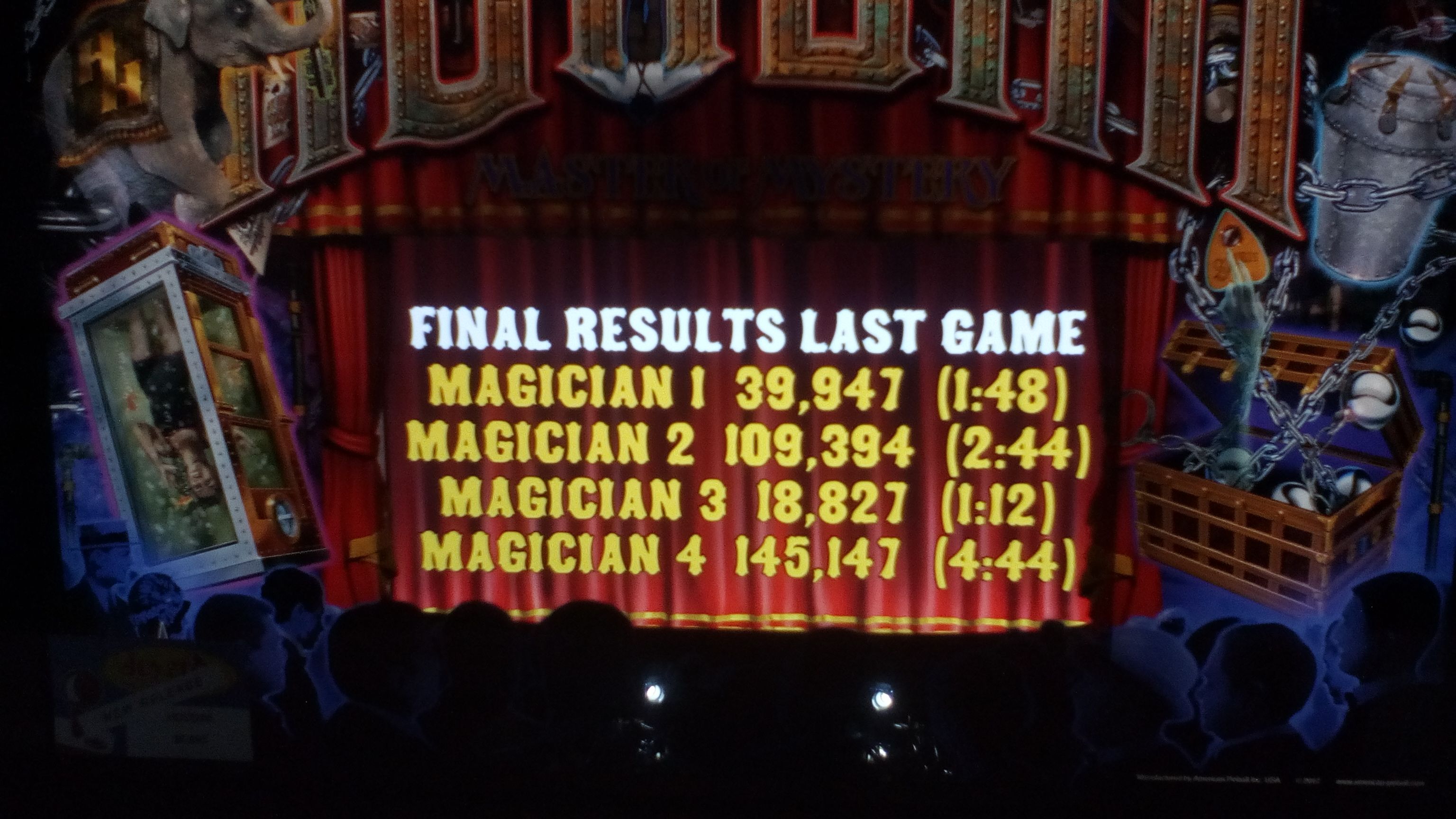 We’d shift from the space-themed games to Houdini for our fourth game. I would be playing second. Greg would put up 5.6K+ for his first ball, a relatively low score on this game. I wouldn’t do much better with 6.4K+, good for third by the time it got back to me as Greg would get to 17.5K+ and David would run up 16.9K+. The second ball would go better, as I’d get the infamous reversed flippers multiball which I’d do rather well on, bumping me up to 47.6K+ but David would run up 141.8K+ which I’d need to beat to have any hope of winning. I’d break into six-digit territory but wind up short with 109.3K+. Still, second place isn’t terrible and it would put me at thirteen standings points on the night with one game left to go. (In perspective, averaging sixteen standings points per week has historically been good enough to get in at the bottom of A division.)