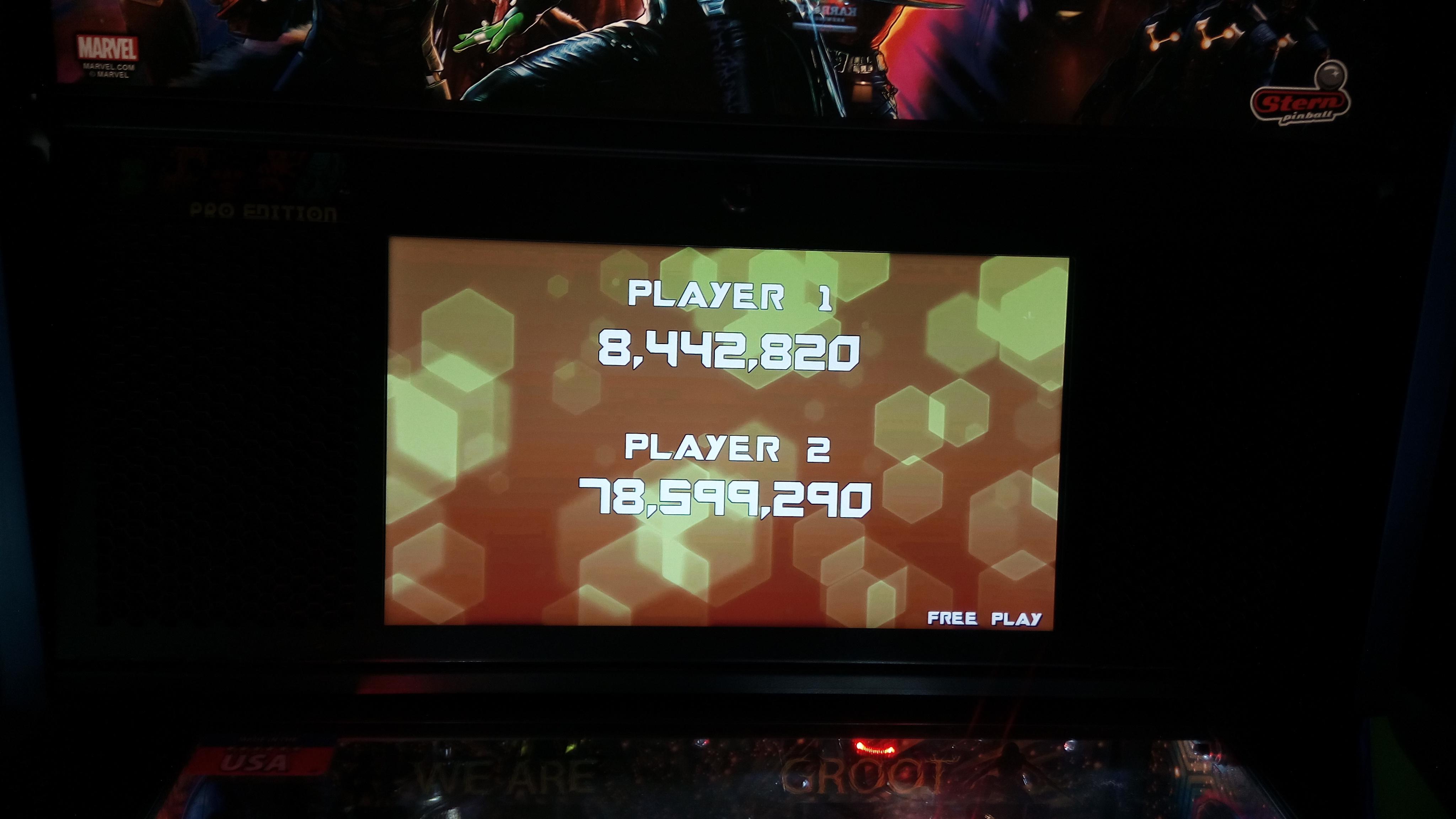 Well, I get Groot Multiball started. I concentrate on just keeping the balls in play and trying to make as many jackpot shots as I can. The next few minutes seem like a blur, but I finally get a chance to catch a glimpse the score counter after the bonus countdown: 82,279,870. Enough of a lead that I could feel like maybe it would hold up. Matt signs off with 11.4M+. Fred signs off with 56.0M+. Finally, Cory signs off with 45.8M+ and I have a first-place finish.