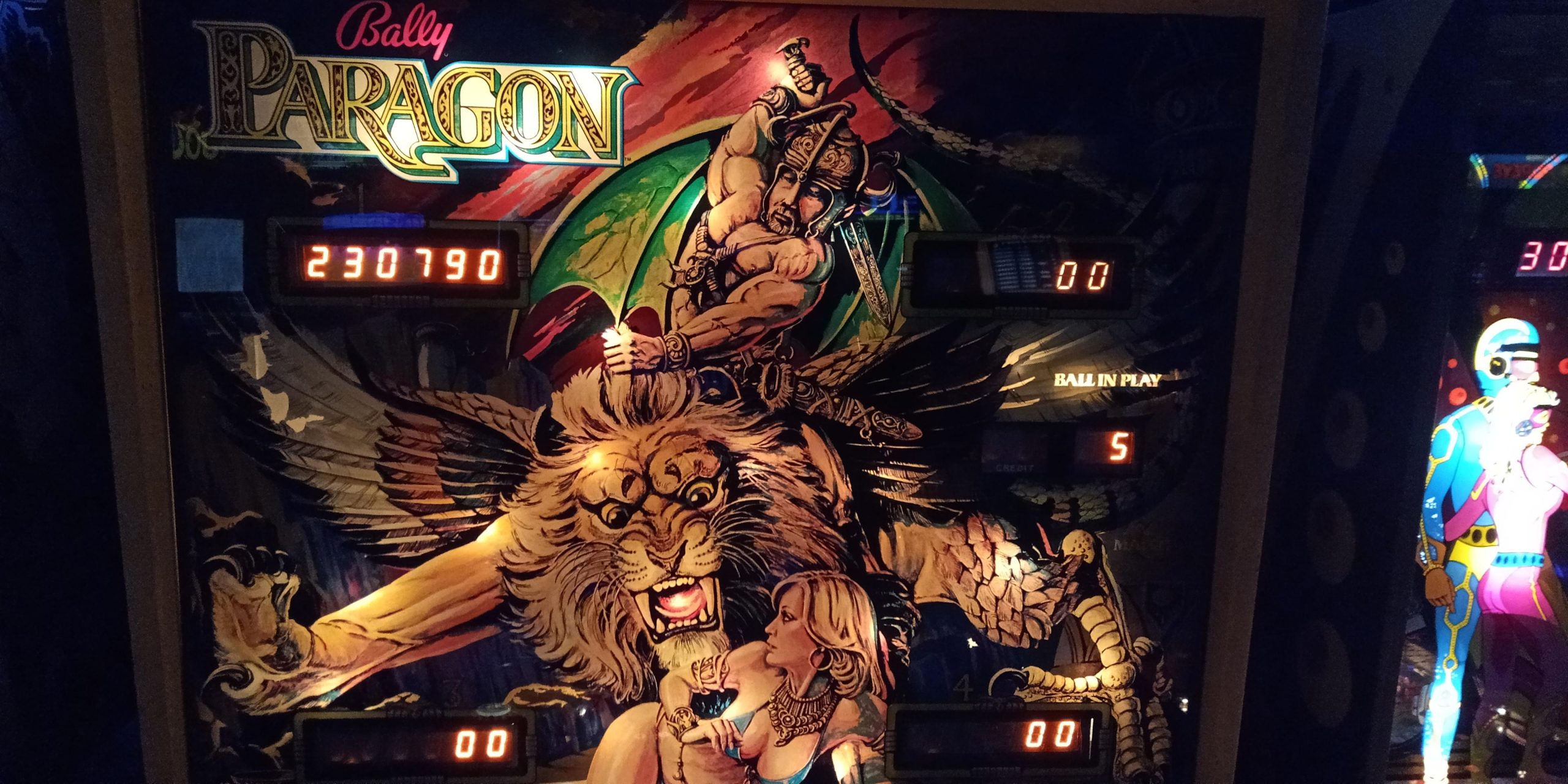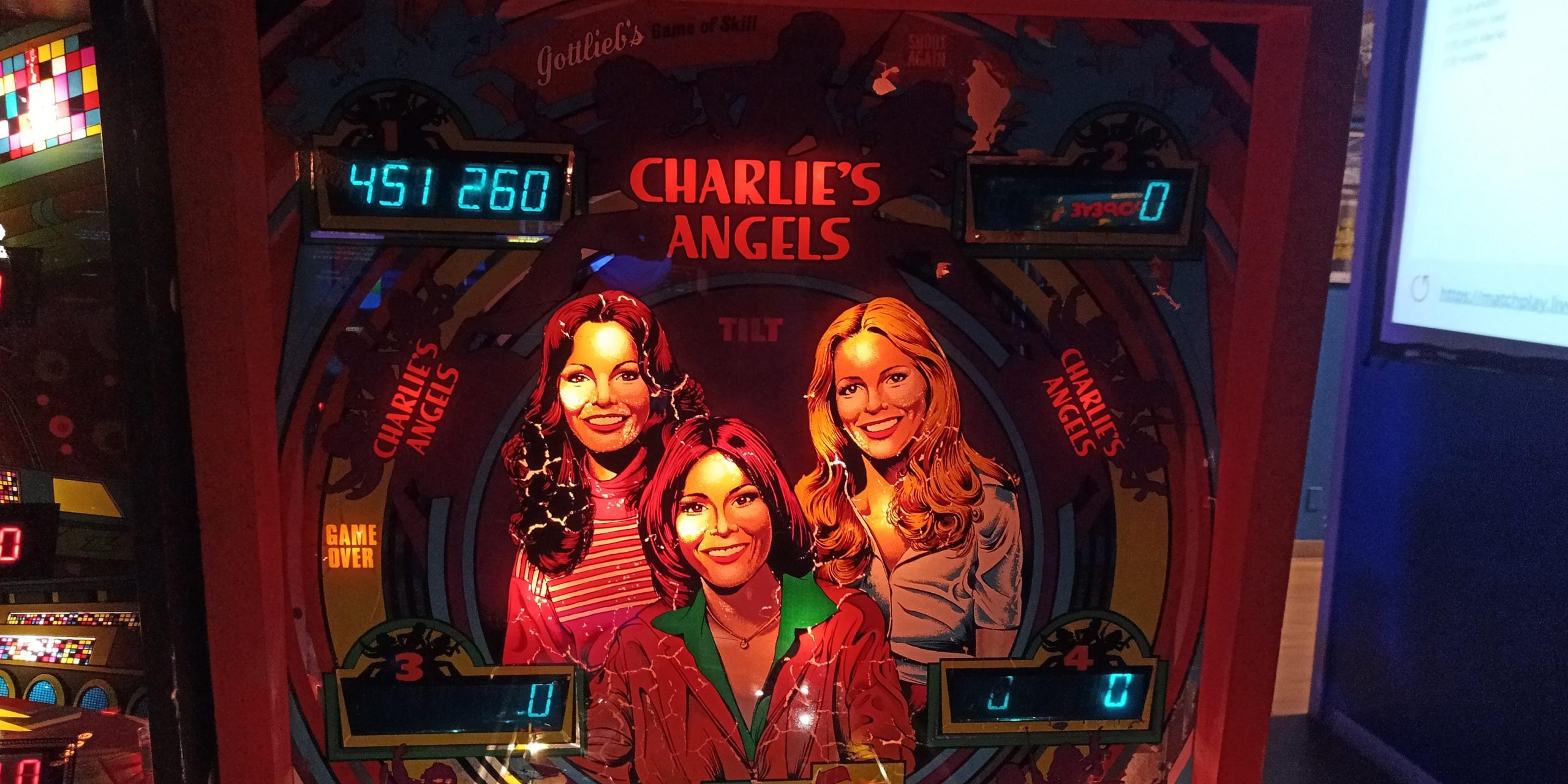 I hung around The Game Preserve and played a few more games of pinball. The highlight of those post-tournament games would be putting up 1,084,770 on Charlie’s Angels–difficult to document due to the fact this is a six-digit score counter machine, so I have the score after my first ball, followed by a picture of the score counter just after rolling it over, followed by the end of game score. For these early Gottlieb SS games, the first 100K points after the rollover, the leading zeros of the score counter will be lit, the only telltale sign of going “over the top”. It only figures that I put together this commanding of a performance after the tournament is over.