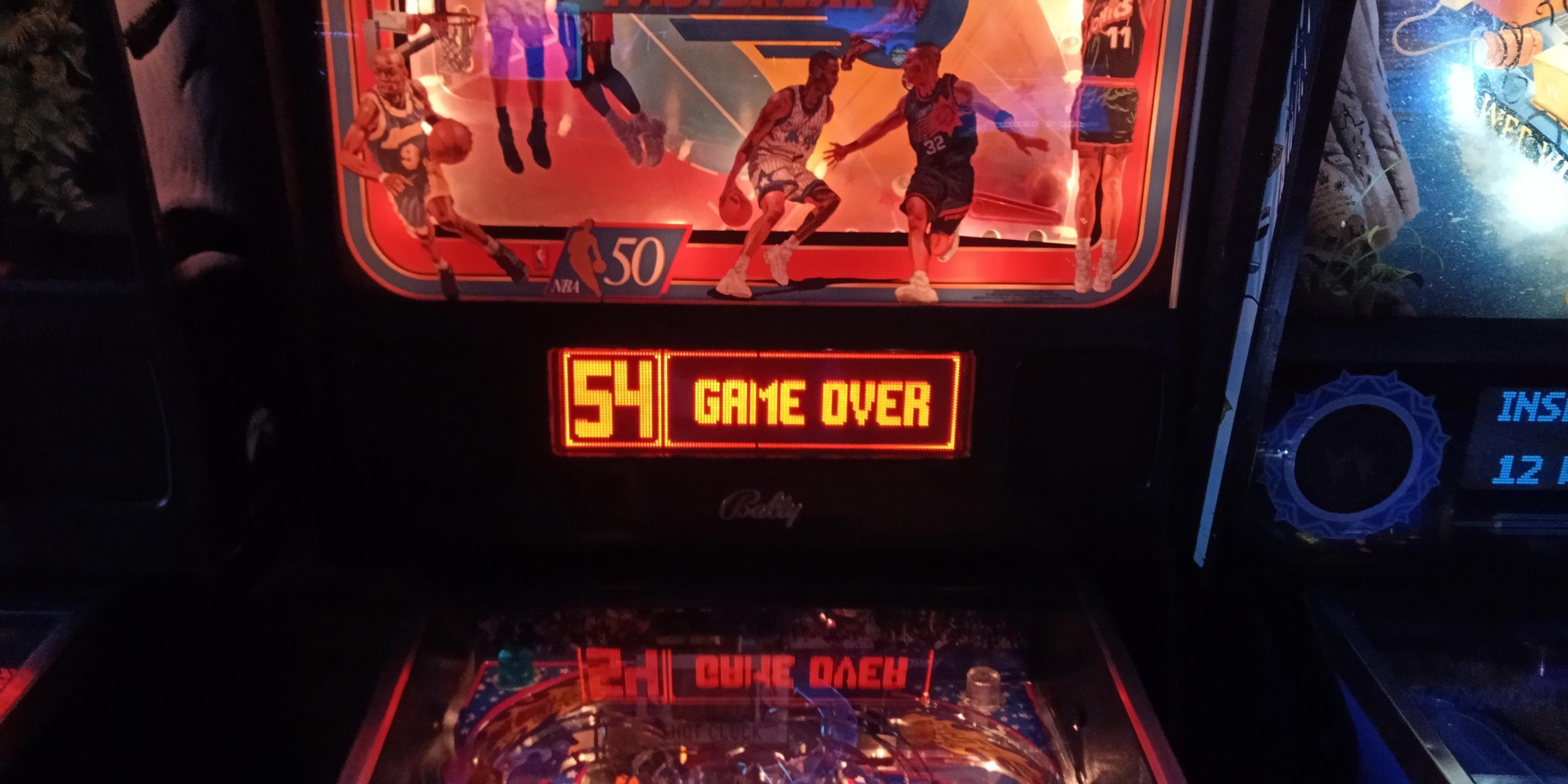 I had a really lousy first ball, and for better or worse I am missing the picture with my score. I do have the picture going into ball 3, showing 11.5M+ for me and 52.7M+ for Lee. This is Twilight Zone, one of the pinballs I played frequently in the mid- to late 1990s, a game I would normally feel confident playing. So much so, that after seeing Lee start a multiball by locking one ball then shooting the ramp, I gave him advice that you can get a much larger potential jackpot (starting at 40M) locking two balls first, than by locking one and shooting the ramp (which starts jackpot at 15M).