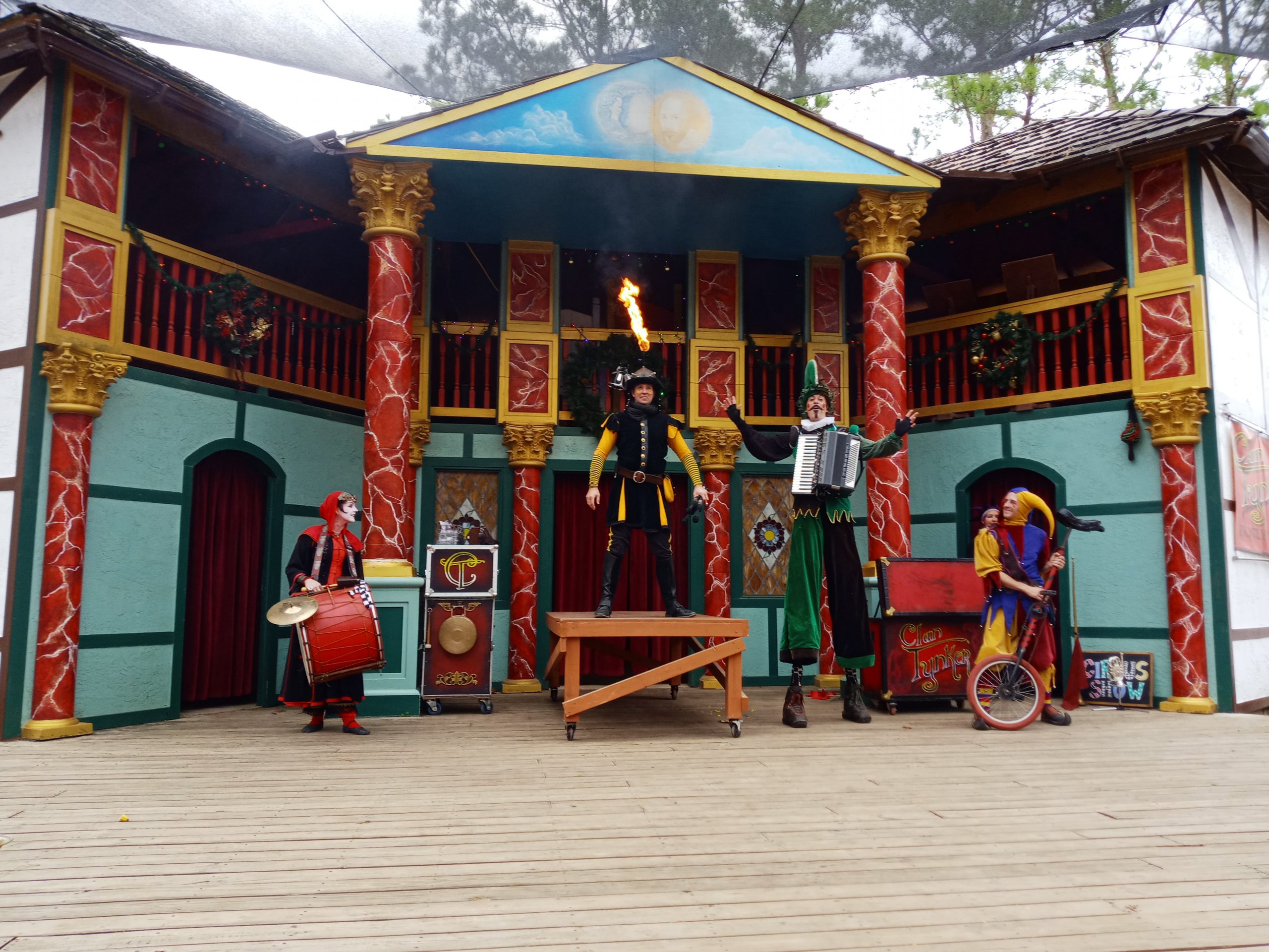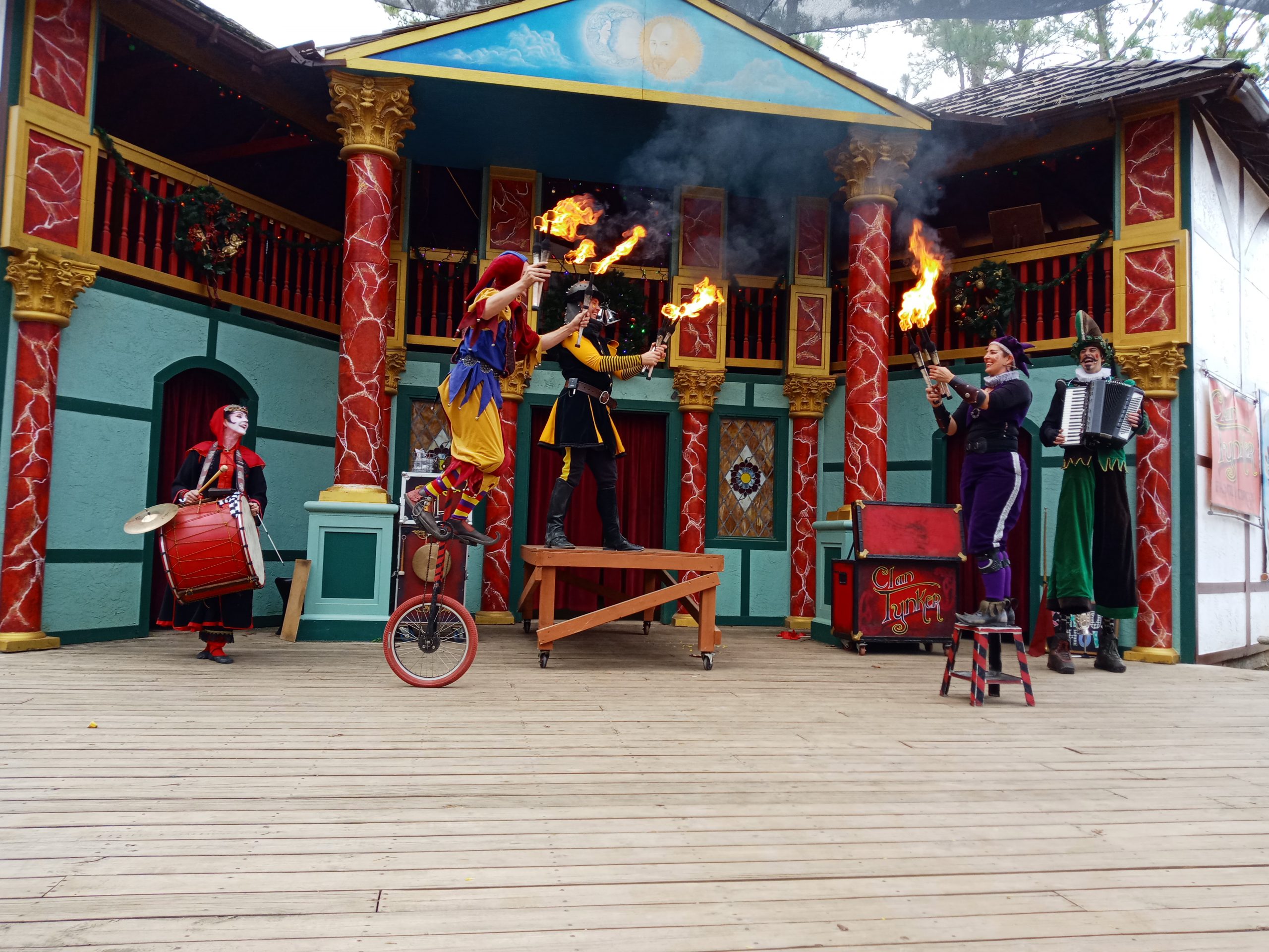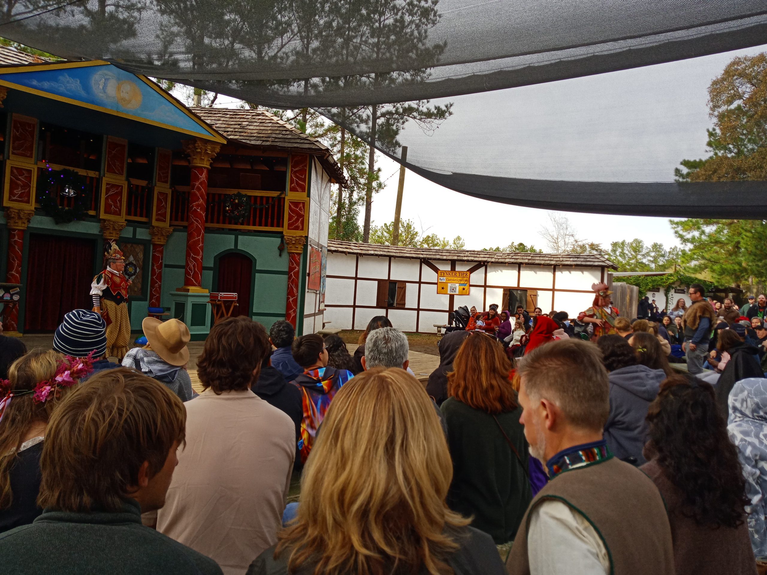 What I did wind up doing was going back over to the Globe for the Royal Proclamation and associated show. Right after this show, the performers led a group walk over to The Arena. I do mean literally “right after”, too; it wrapped up frighteningly close to the 19:20 (7:20pm) start of Solar Rain’s act. And unfortunately, right after getting to The Arena, I had to answer the call of nature. (I was already in the standing room only crowd in the top row.) It was a challenge enough to quickly find a restroom in the area. Finding my way back to The Arena was surprisingly difficult in the fading light. Word to the wise: don’t blindly follow the masses coming out of the restrooms, many of them are heading out towards the front gates to go back home or back to camp.