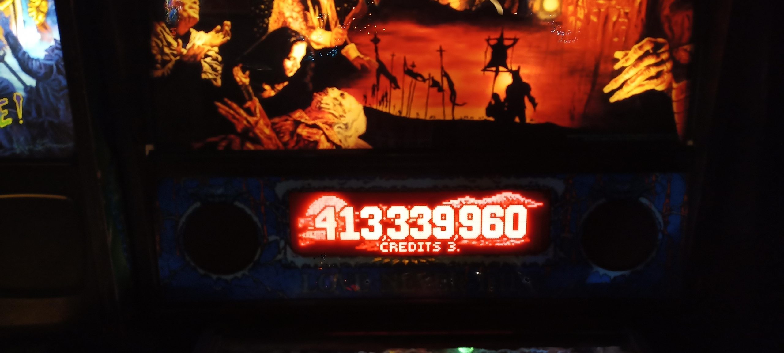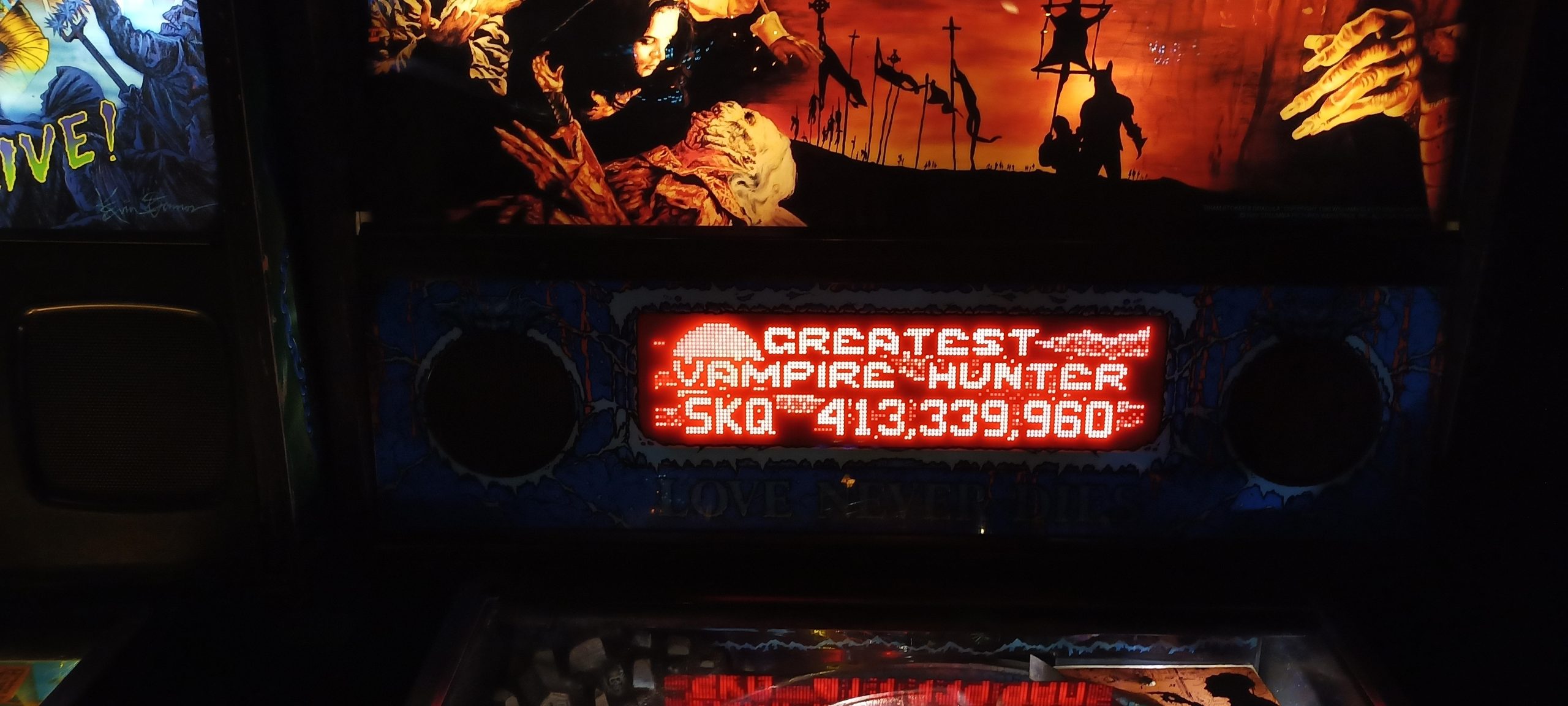 Not surprisingly, I did well at Dracula and kept playing. I would crack the high score list twice with scores just barely good enough to make it. Then, I would bust loose with a first ball that was over 150M at one point (I think 200M+ after bonus). After the earned extra ball I was over 300M and guaranteed grand champion. I would sign off with 413,339,960 for grand champion and a new personal best.