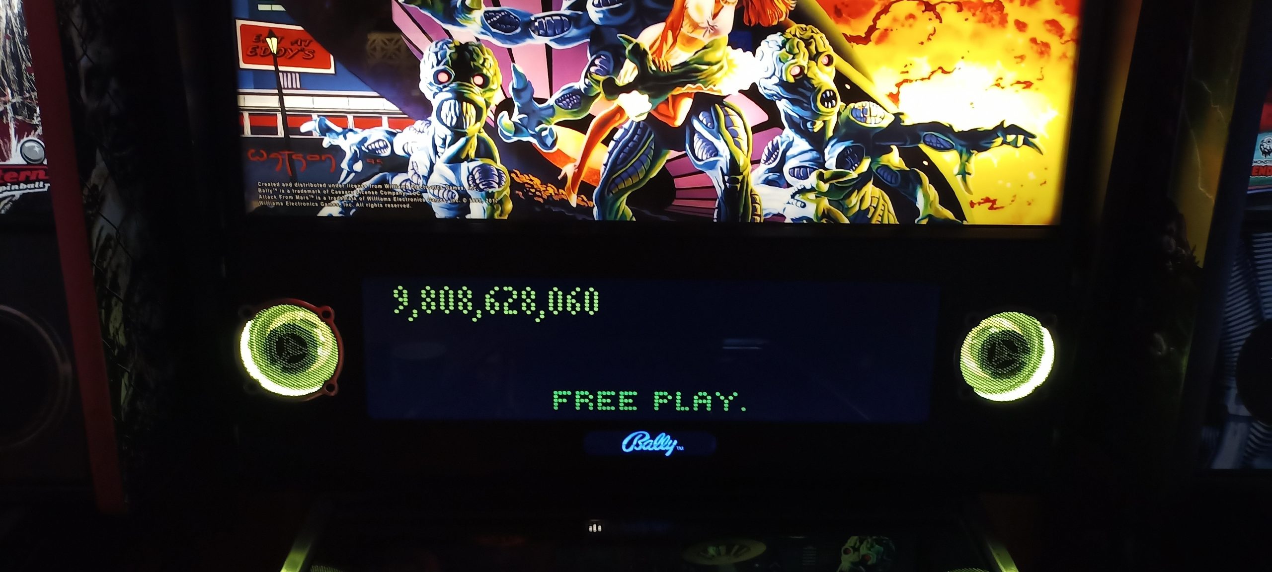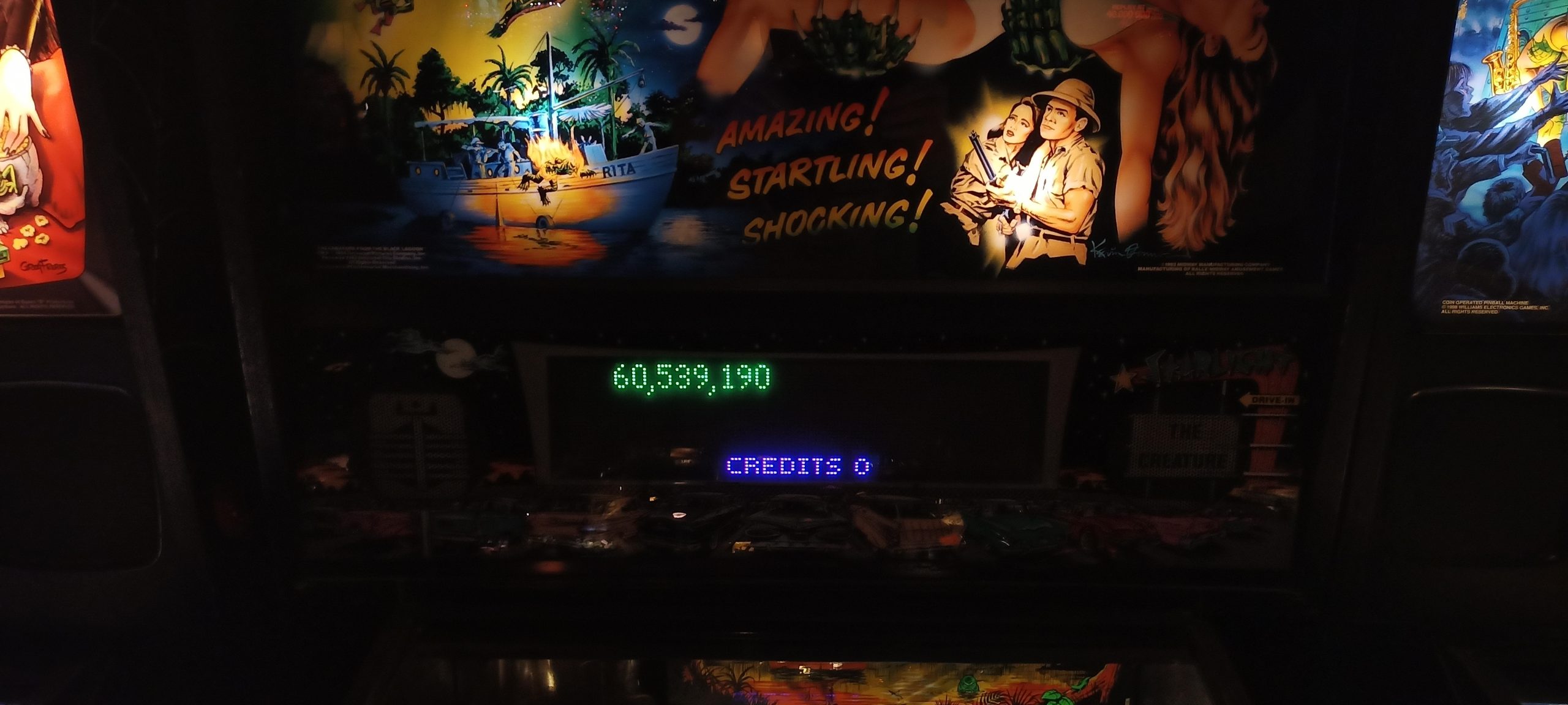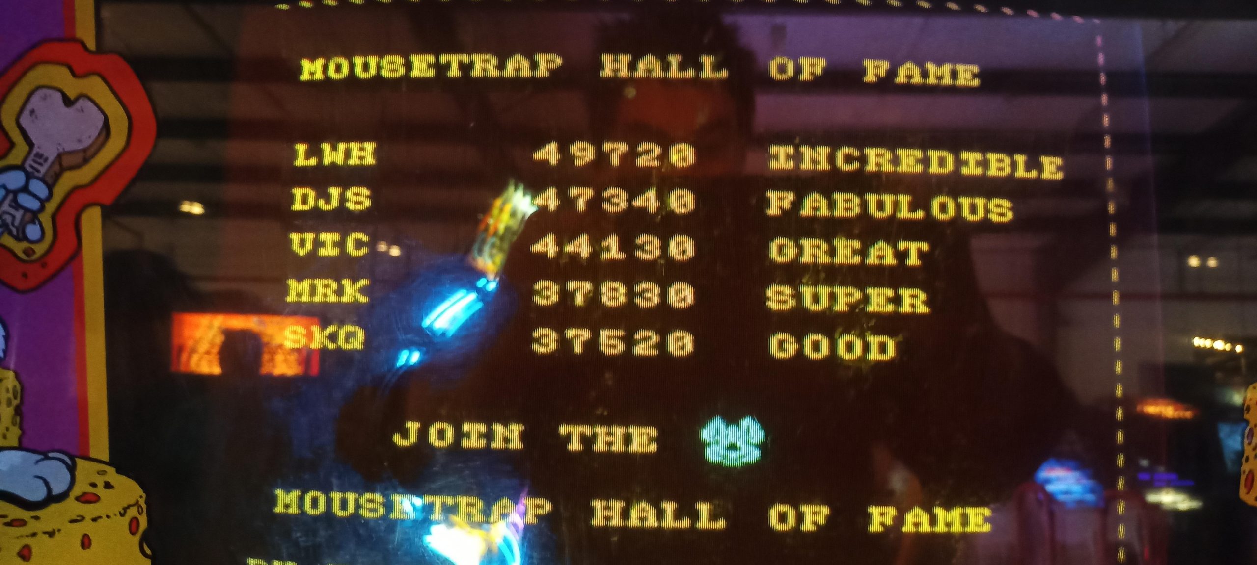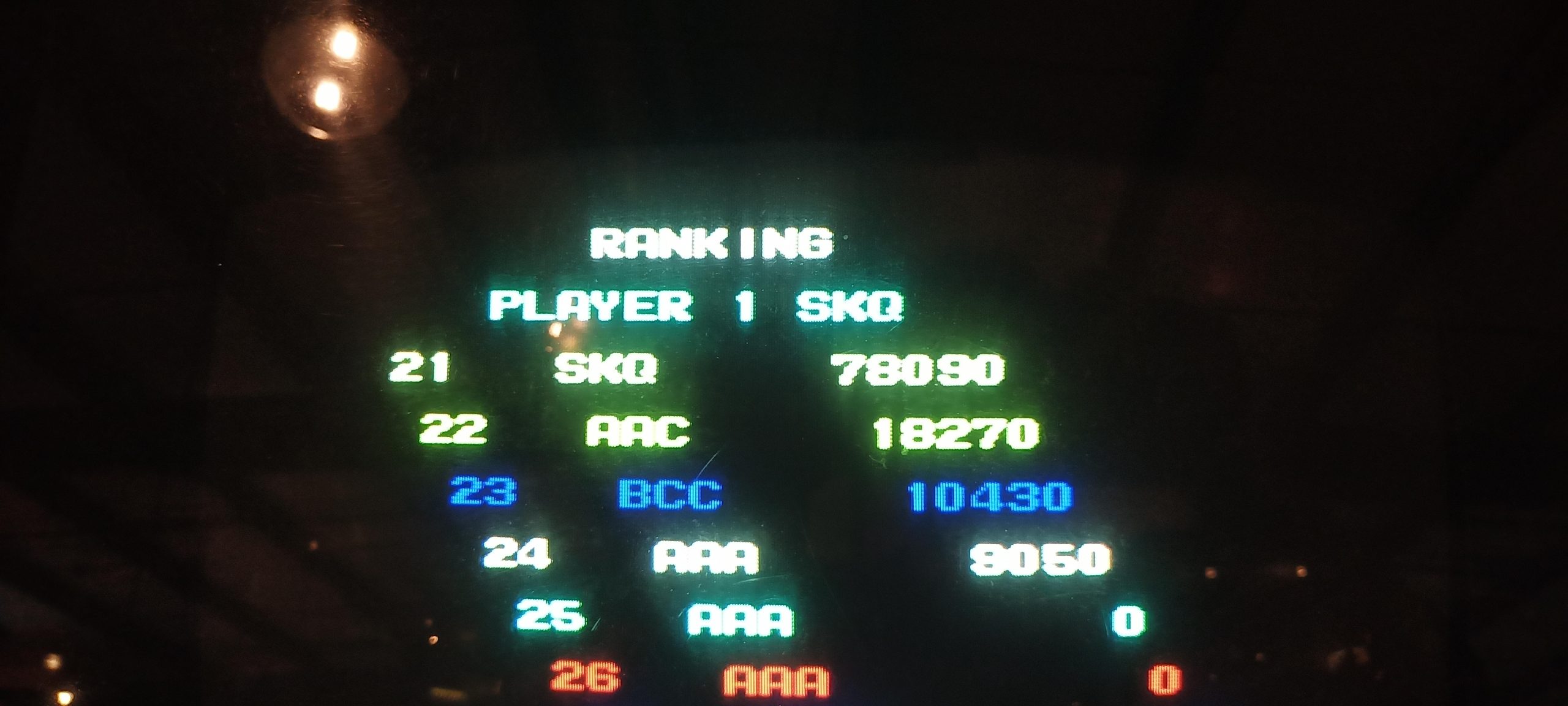 I’d start off with a real stinker of 1.35M+ and would wind up winning enough replays to turn that five credits I started with into a whopping sixteen games actually played, lasting easily an hour and a half. (I’d have to dig up the photo timestamps to compare the sessions during which I put up other high scores, but they are probably about the same or slightly longer.) By the time I was done, the score to get a replay had skyrocketed to 10.2M (it started at 4.2M) and I had put up three of the four lower high scores: 23.1M+, 18.4M+, and 10.5M+. That left only PBK’s 13.9M+ of the high scores that were up on my arrival.