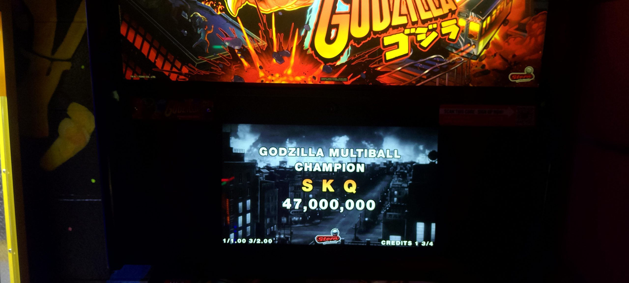 I paid for one credit on NBA and won a second credit via match. The second game’s score was a bit higher so that’s the one I’m posting. After this I played one game of Rick and Morty (taking advantage of the ⅙ credit making my cost $1.25) then moving over to Godzilla. I had a fairly decent romp on Godzilla. I paid for a total of six credits ($1.50 by coins, then $5 for five via credit card) and wound up winning one replay for a total of seven actual games. In the process I “redecorated” what was apparently a freshly reset high score list (thus all the pictures; I made no attempt to document which mode records were set in which games, so this is just what was on the board at the very end).