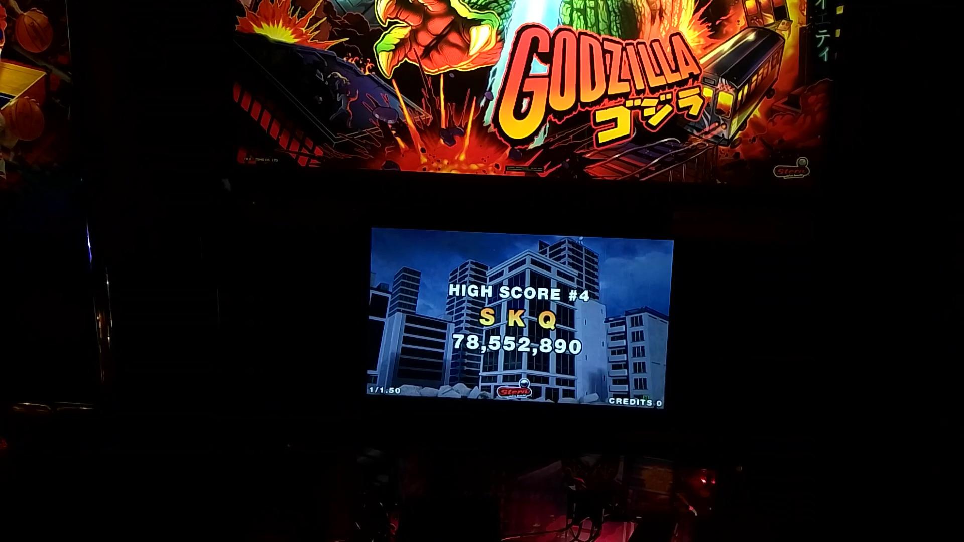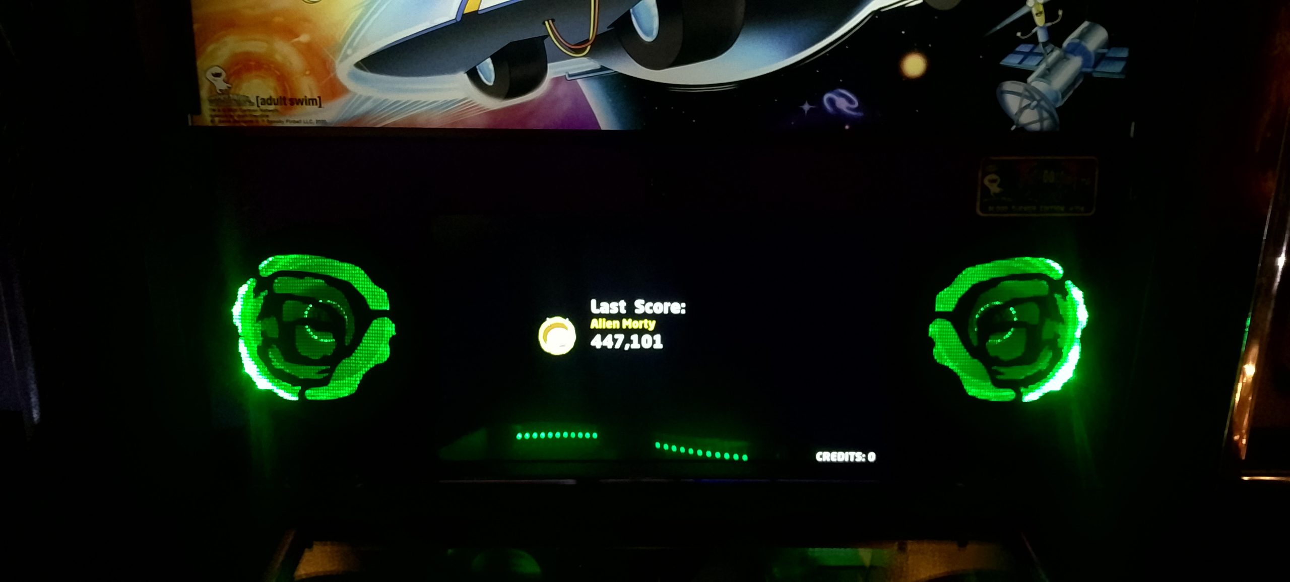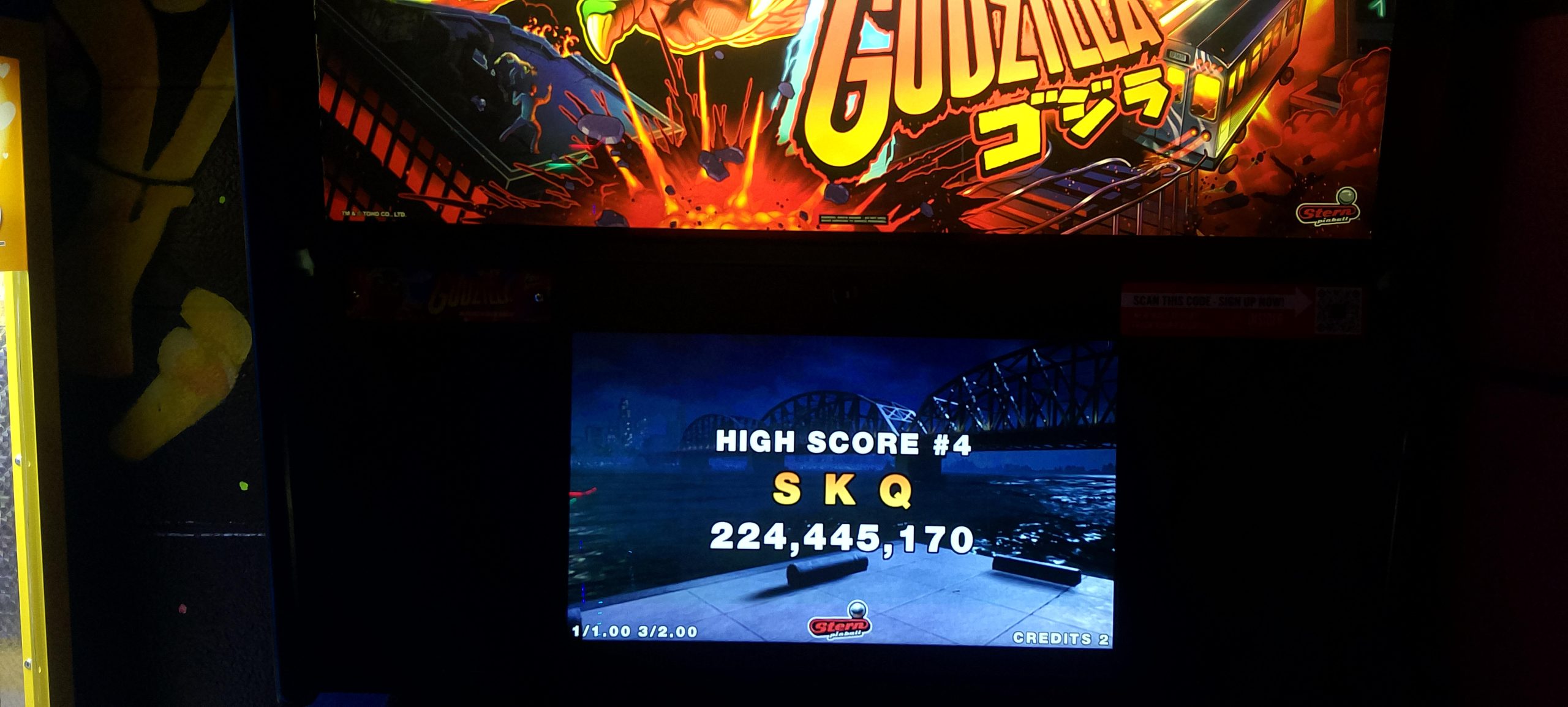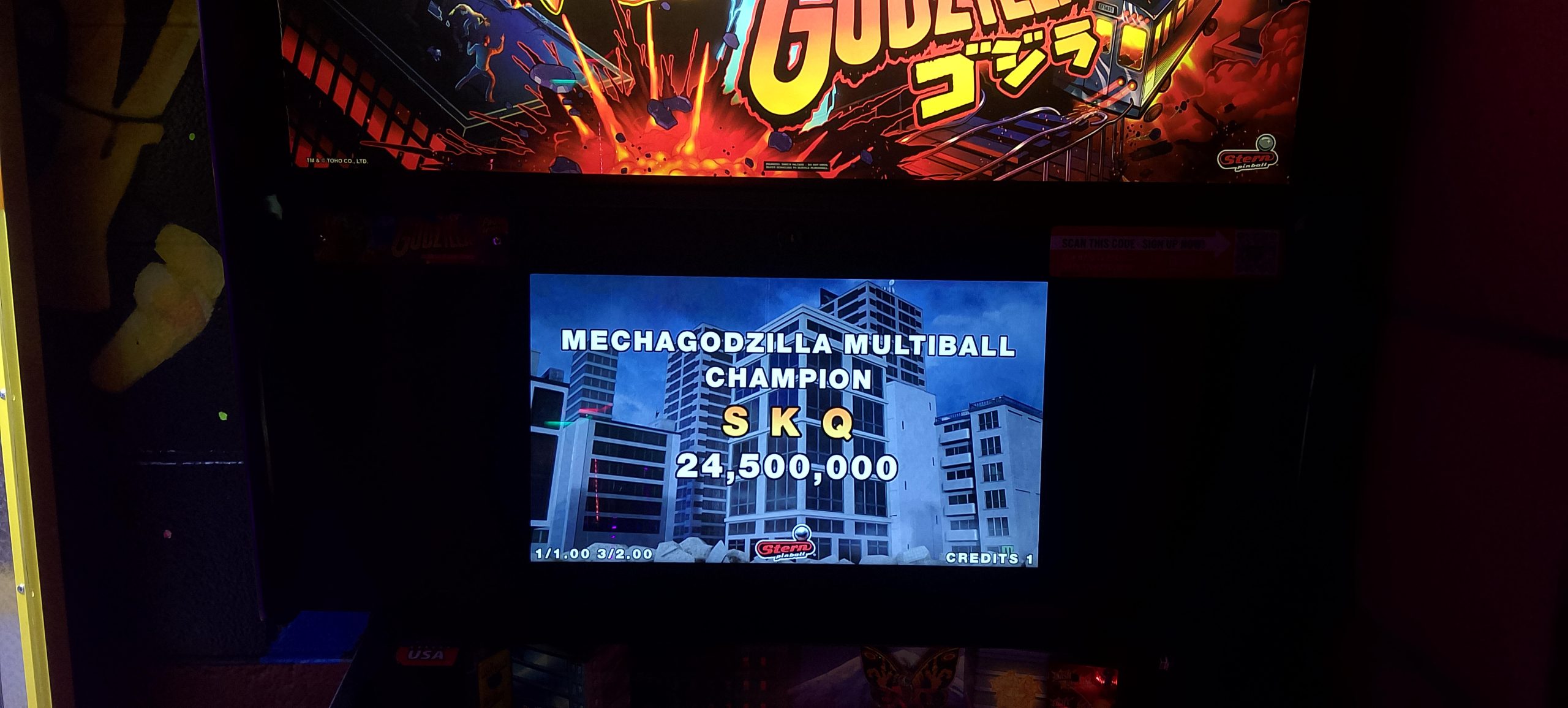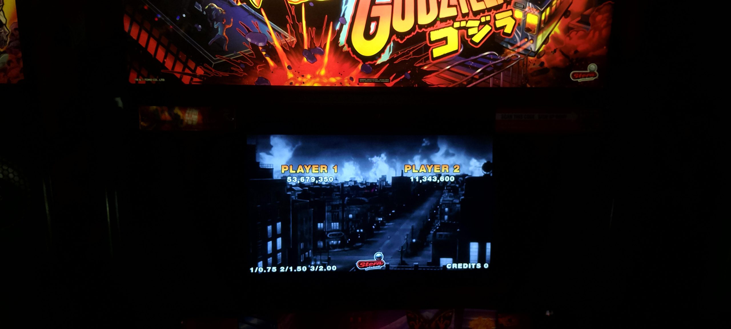 I paid for one credit on NBA and won a second credit via match. The second game’s score was a bit higher so that’s the one I’m posting. After this I played one game of Rick and Morty (taking advantage of the ⅙ credit making my cost $1.25) then moving over to Godzilla. I had a fairly decent romp on Godzilla. I paid for a total of six credits ($1.50 by coins, then $5 for five via credit card) and wound up winning one replay for a total of seven actual games. In the process I “redecorated” what was apparently a freshly reset high score list (thus all the pictures; I made no attempt to document which mode records were set in which games, so this is just what was on the board at the very end).