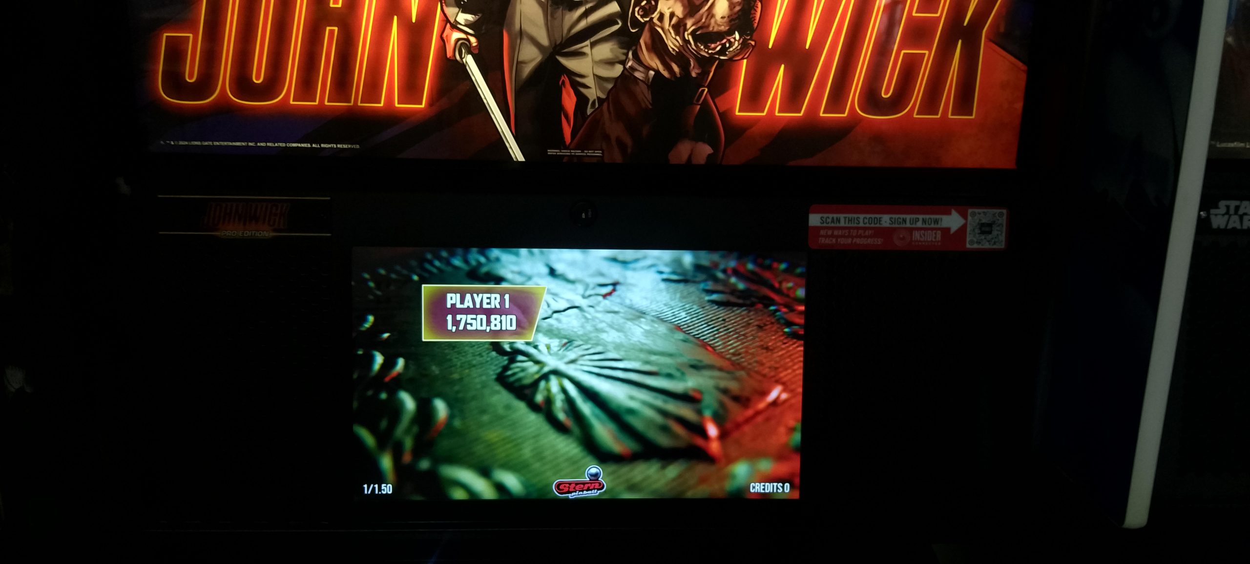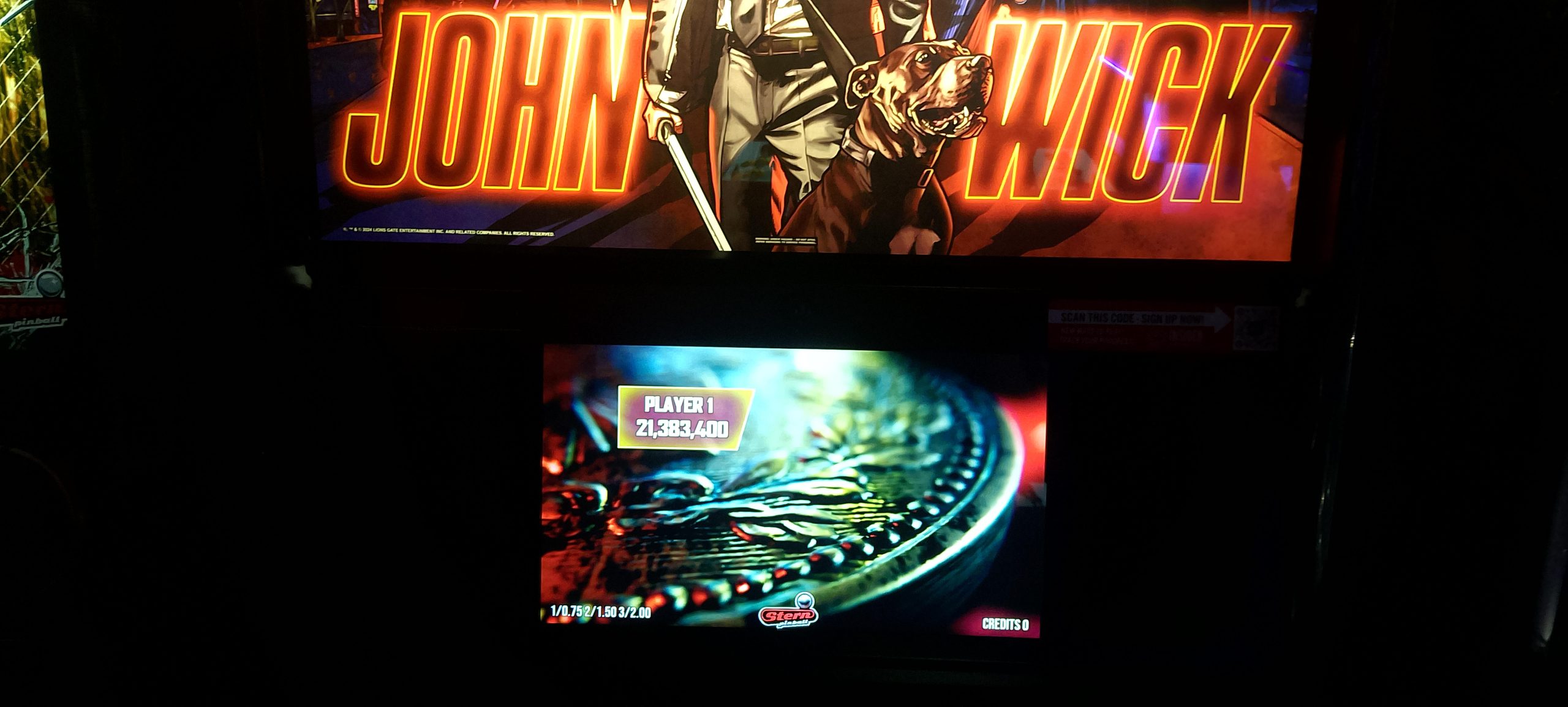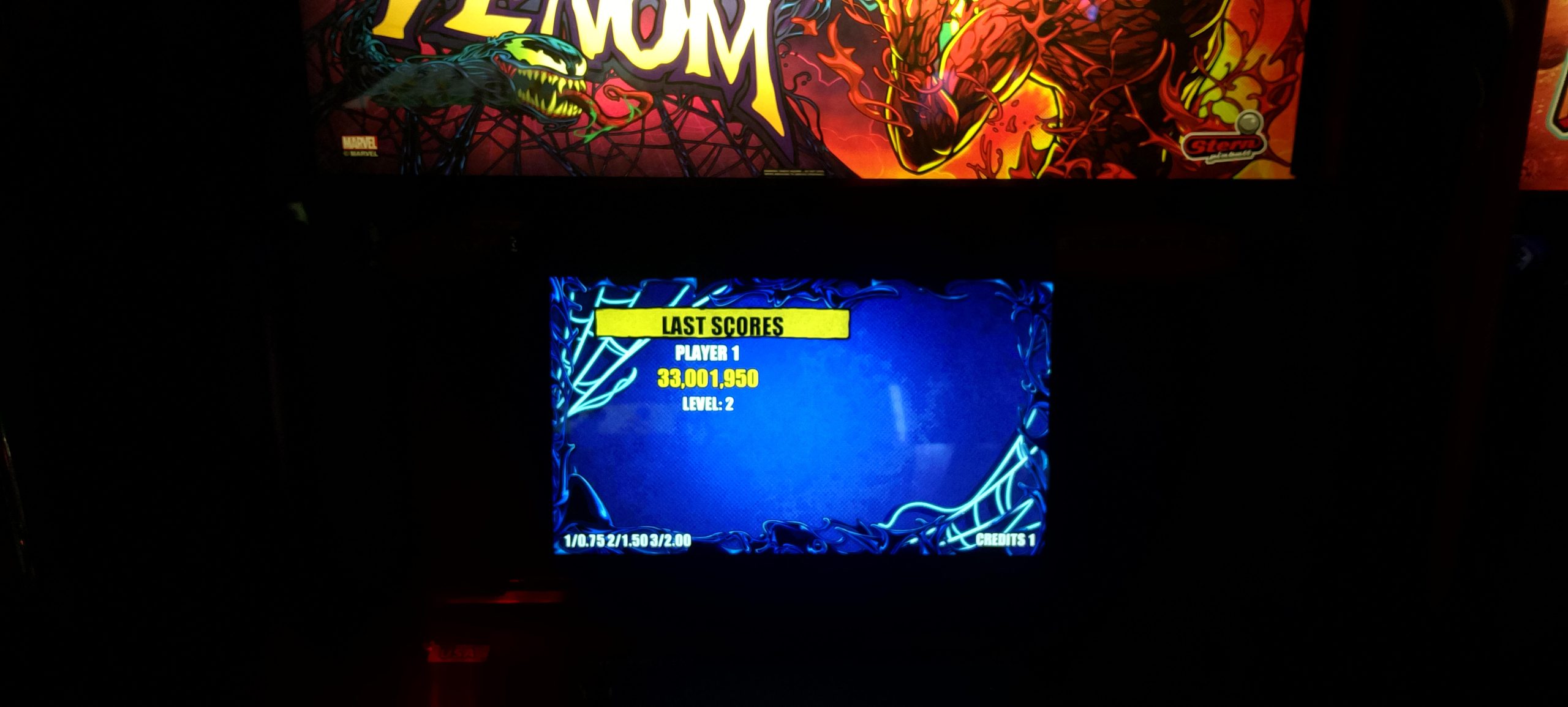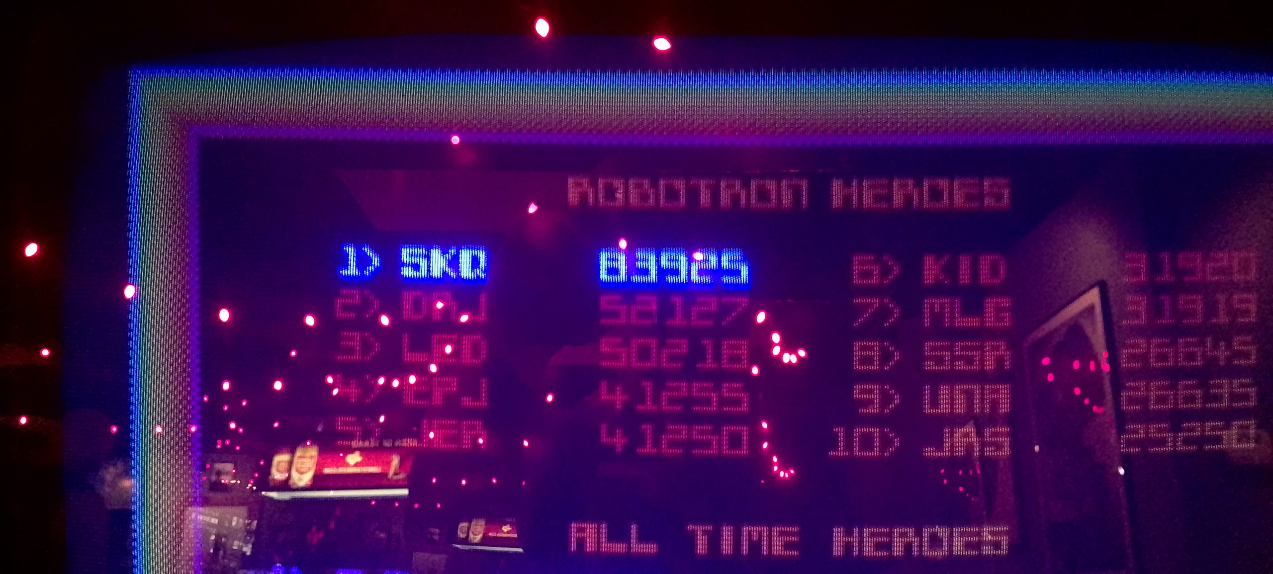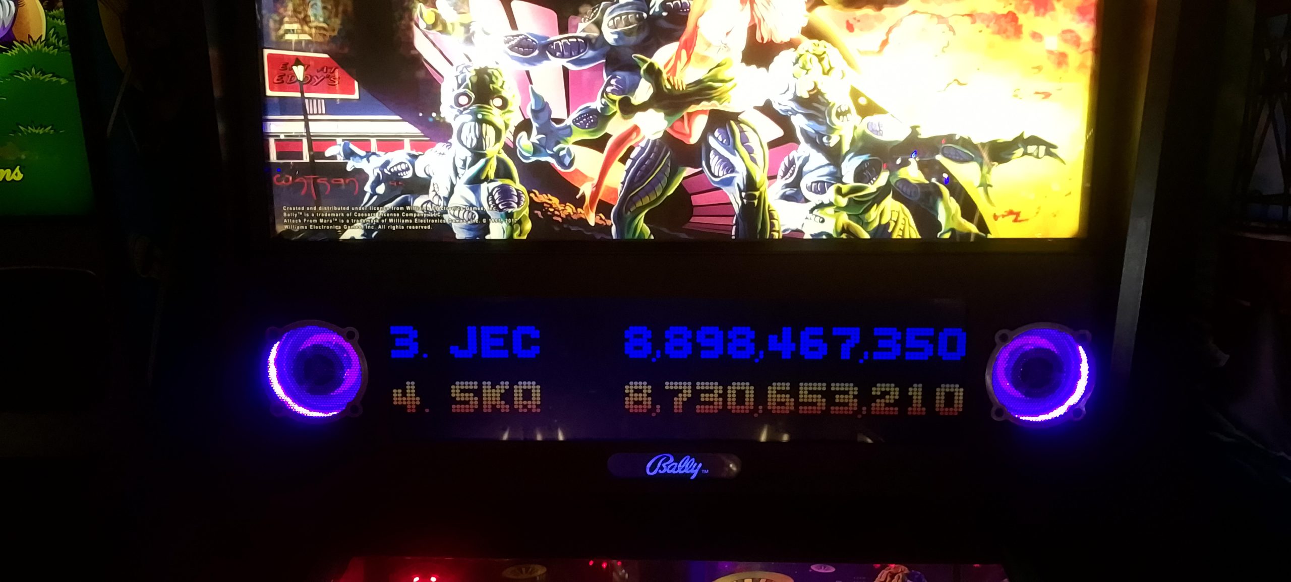 I paid for one credit on NBA and won a second credit via match. The second game’s score was a bit higher so that’s the one I’m posting. After this I played one game of Rick and Morty (taking advantage of the ⅙ credit making my cost $1.25) then moving over to Godzilla. I had a fairly decent romp on Godzilla. I paid for a total of six credits ($1.50 by coins, then $5 for five via credit card) and wound up winning one replay for a total of seven actual games. In the process I “redecorated” what was apparently a freshly reset high score list (thus all the pictures; I made no attempt to document which mode records were set in which games, so this is just what was on the board at the very end).