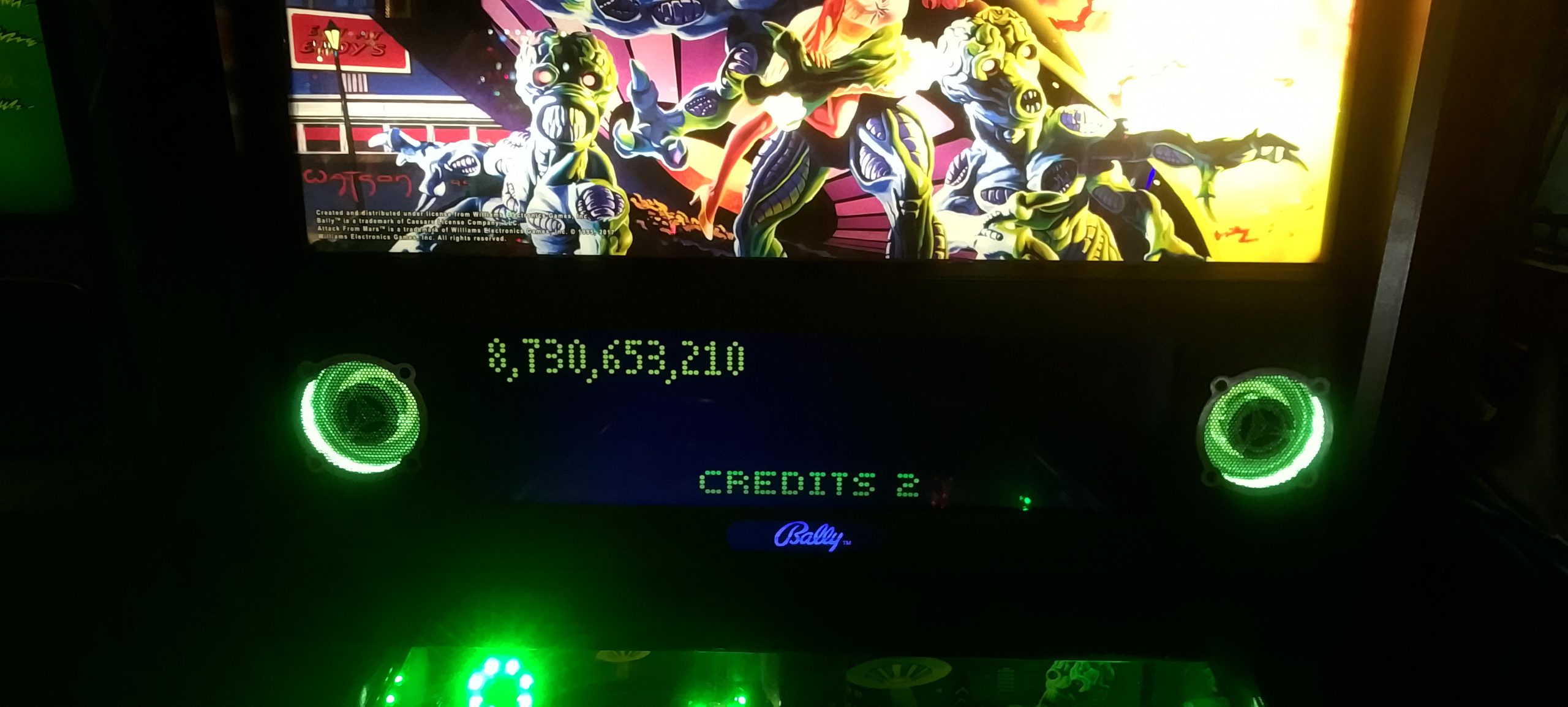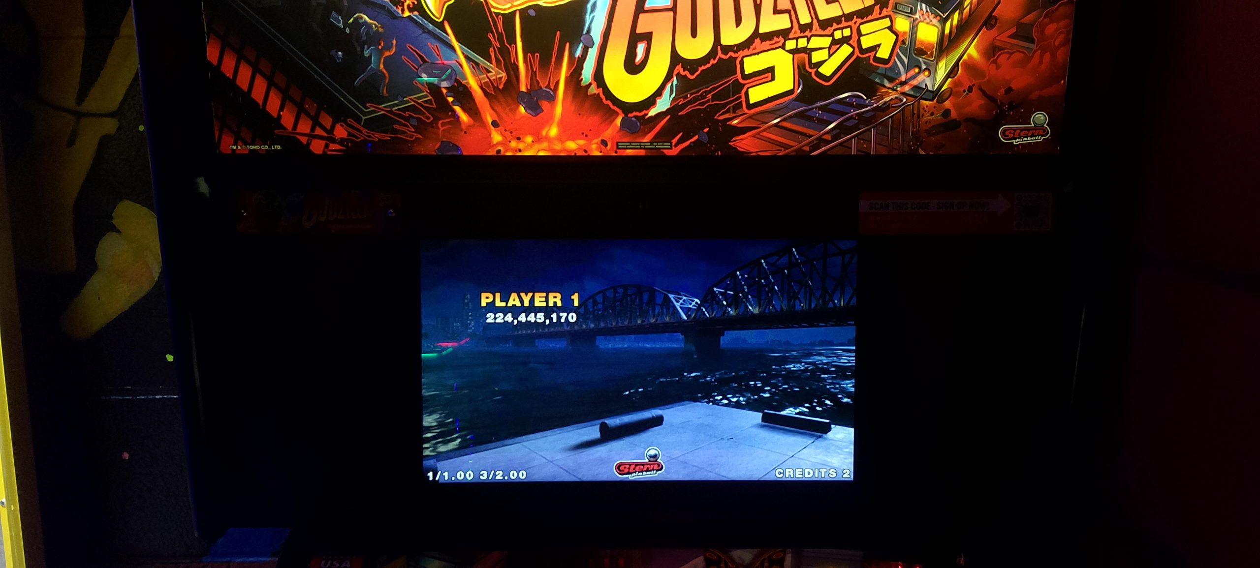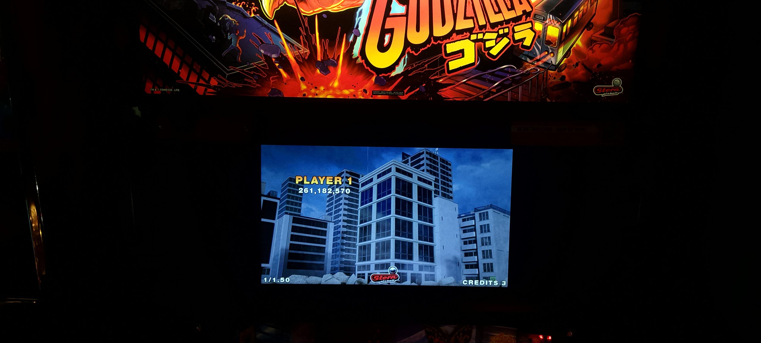 So I haven’t dropped by Del Mar Lanes in a little while. Much to my surprise, upon my arrival I noticed a freshly started game on Godzilla just sitting there, with another ¾ of a credit. So I got to play two paid credits for a whopping 25 cents total. I say two paid credits because it wound up being no less than six games. I put up another high score and a few more mode records. (I still have the 606.7M+ grand champion from April 10 as well as the rest of the high score board from the last reset.)