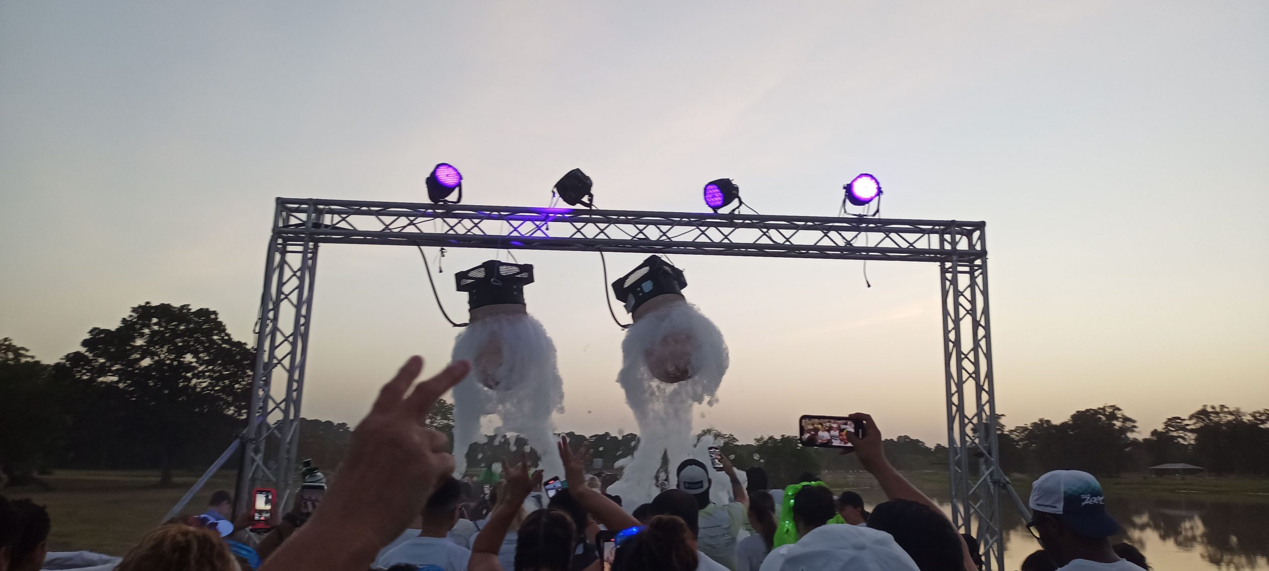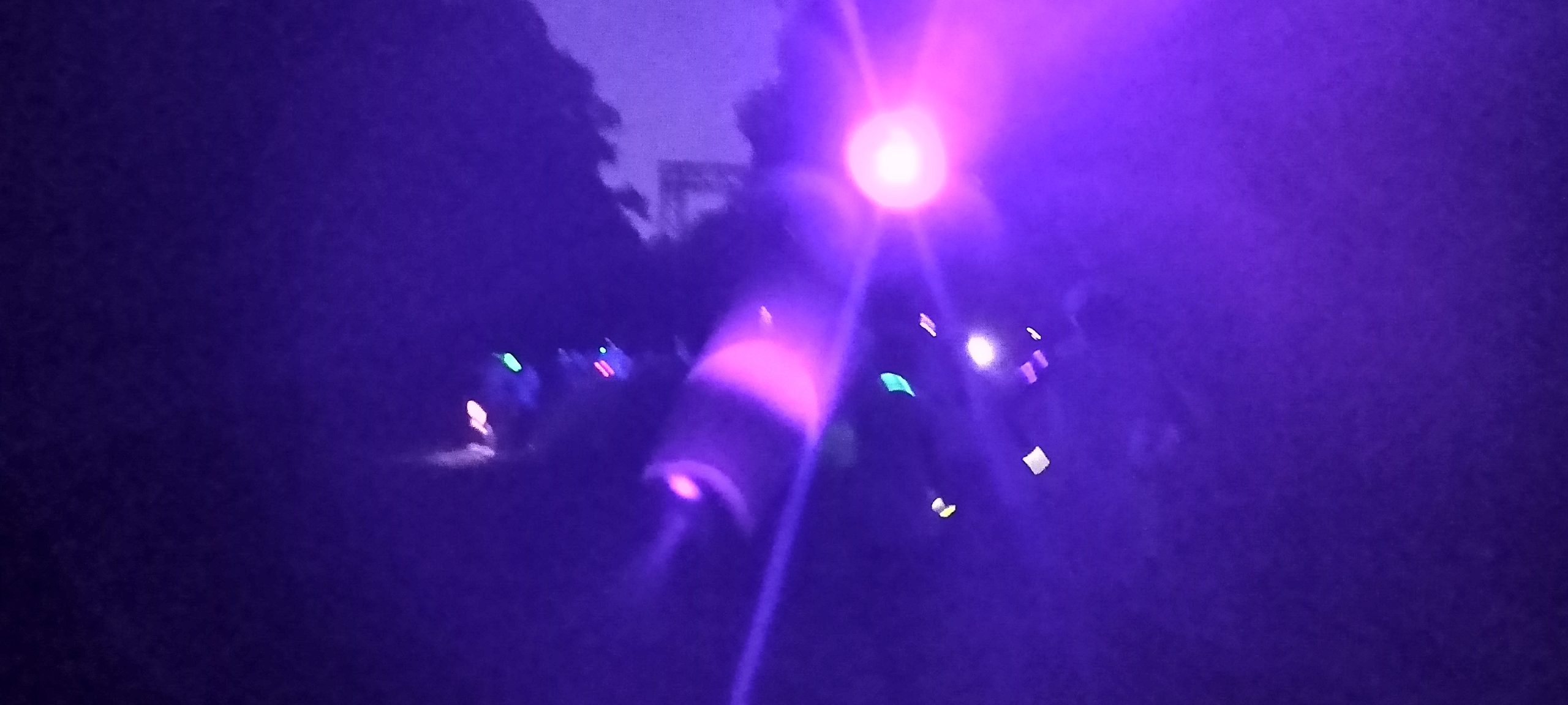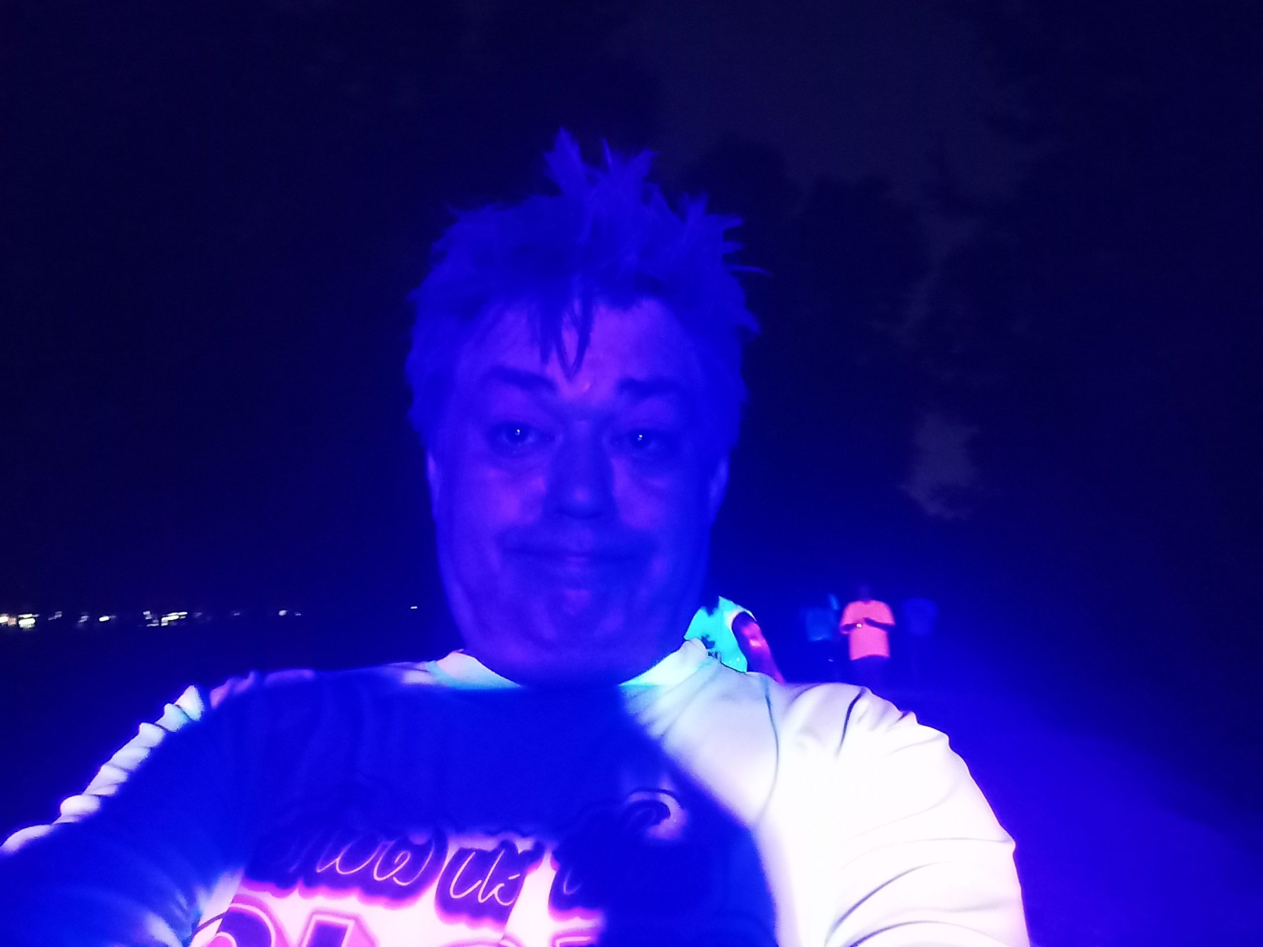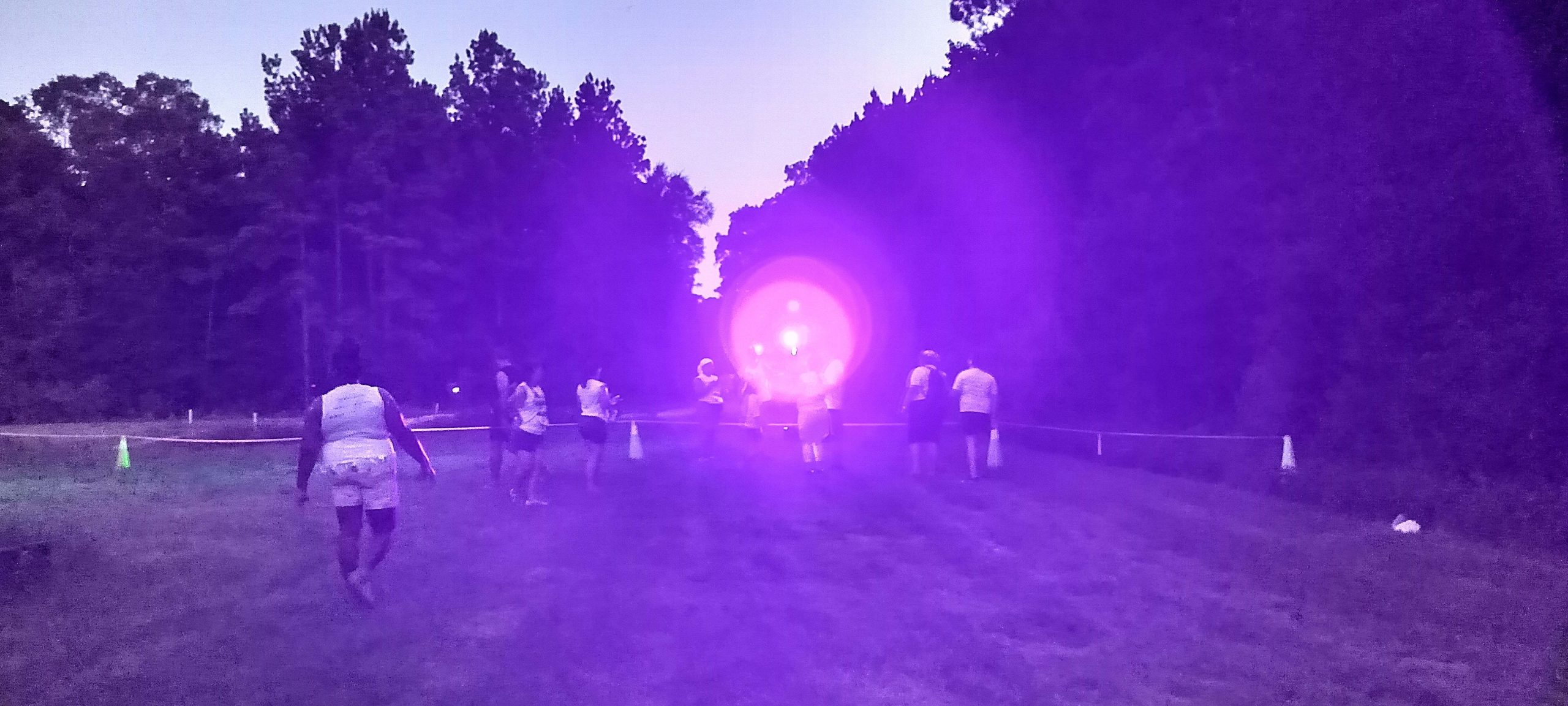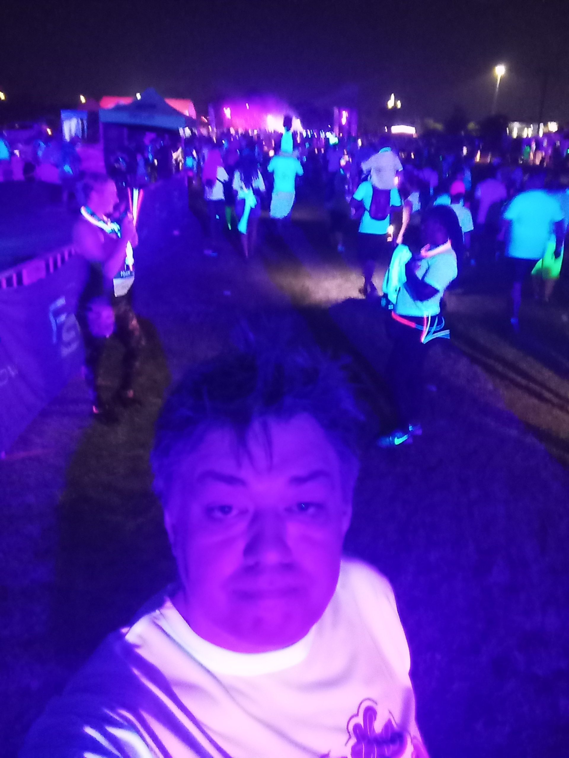 A lot of the pictures show black lights during the after-sunset portion of the event, so it is easy for the casual observer to conclude the course was lit like this for the entire length. It was not, as these were taken at specific points near the foam machines; toward the end the flashlight feature of my phone (and the phones of other participants for that matter) became quite useful.