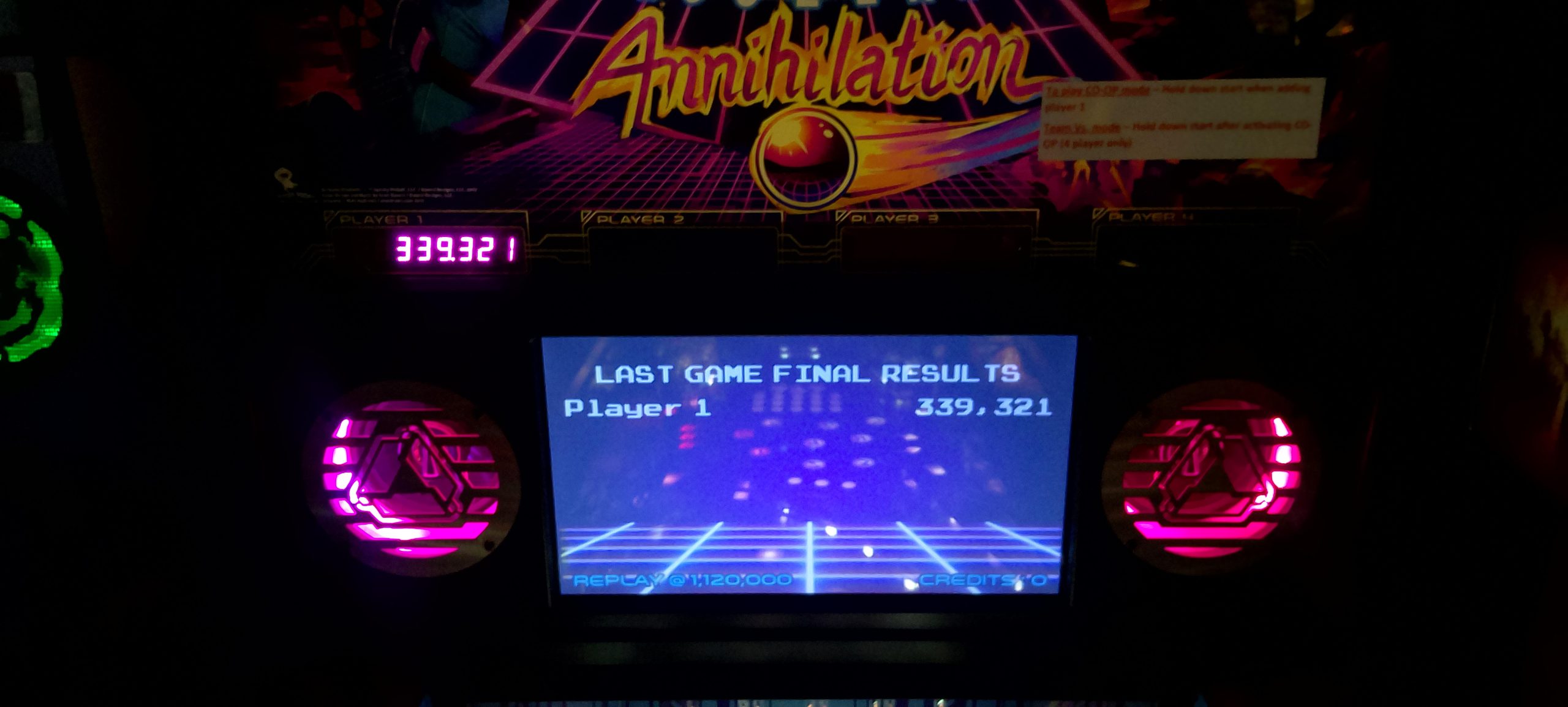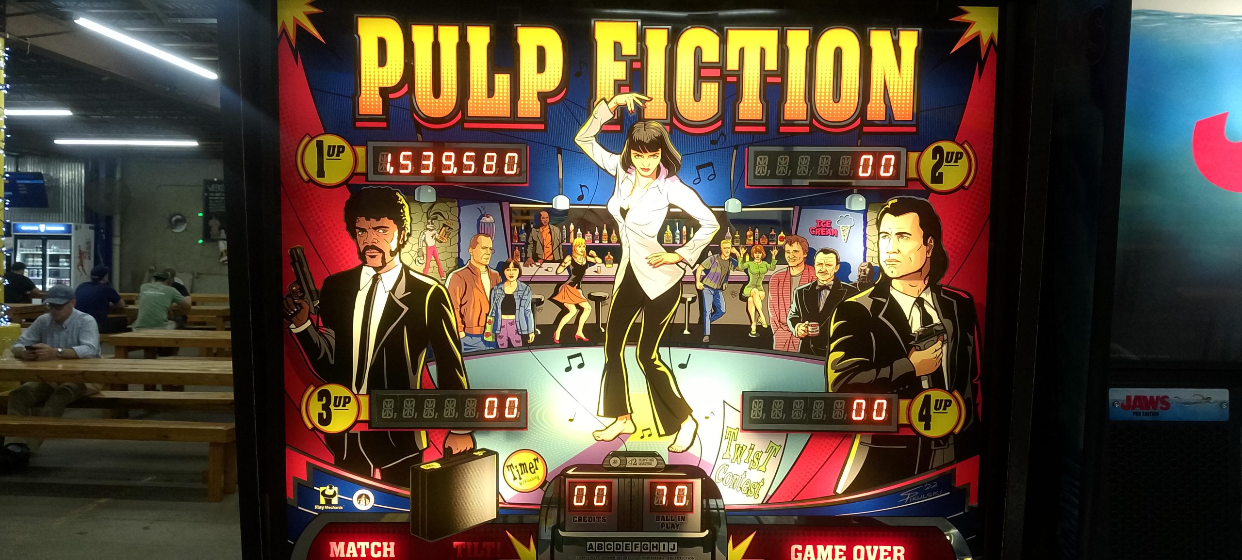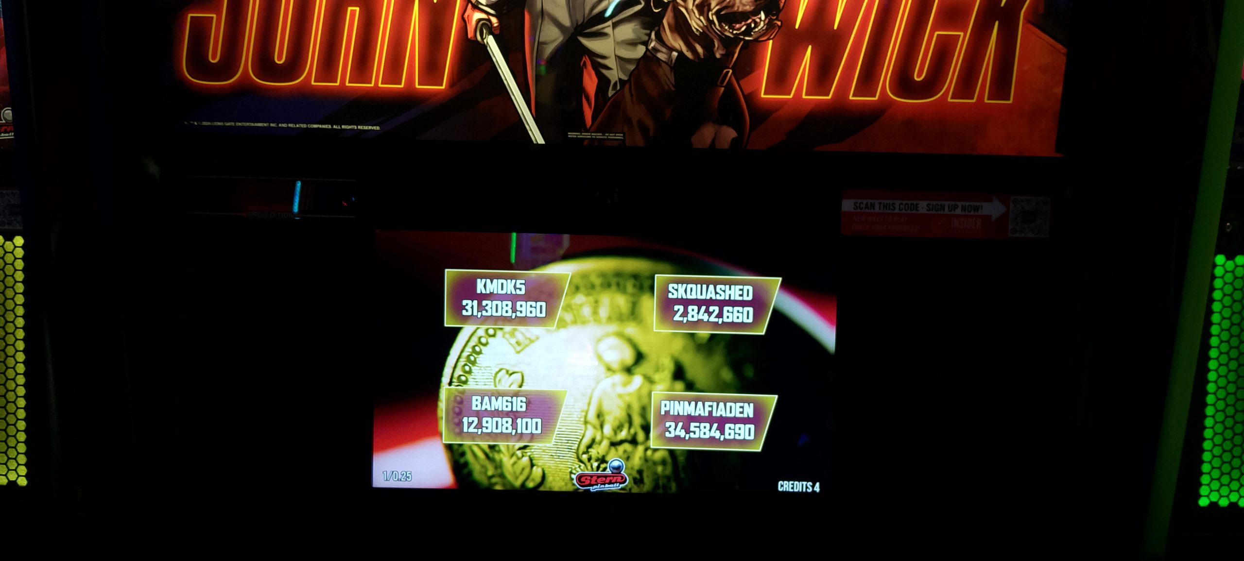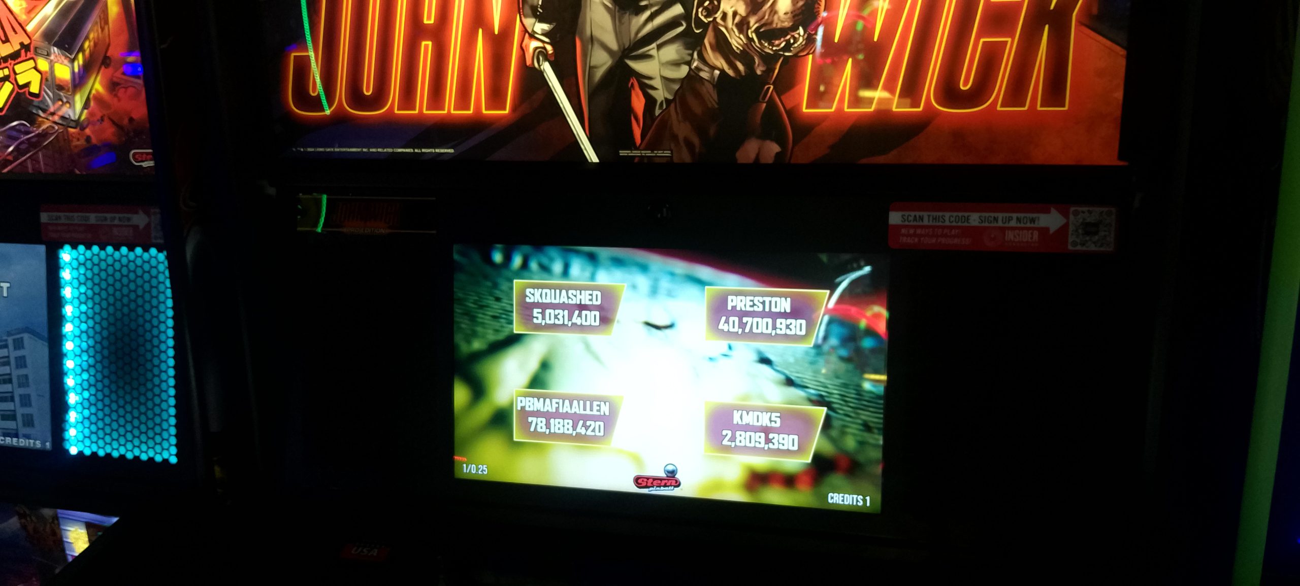After waiting for a late arrival or two, round one is announced. We have a total of 16 players, which makes for a nice and even four groups of four. I am on John Wick grouped with Kelly Moncla (first player), Benjamin McCormick (third player), and Dennis Moncla (fourth player). I’ll just summarize and say this game was a stinker. I had a whopping 1.05M+ at the end of my second ball (of a three-ball game). For comparison Kelly had 29.8M+ and Benjamin had 12.4M+ after two of the three balls had been played. Dennis would take the game though with a huge third ball, 34.5M+ to Kelly’s 31.3M+ and Benjamin’s 12.9M+, all of which completely dwarfed my 2.8M+. There’s nowhere to go but up, or at least that’s what I’m hoping.