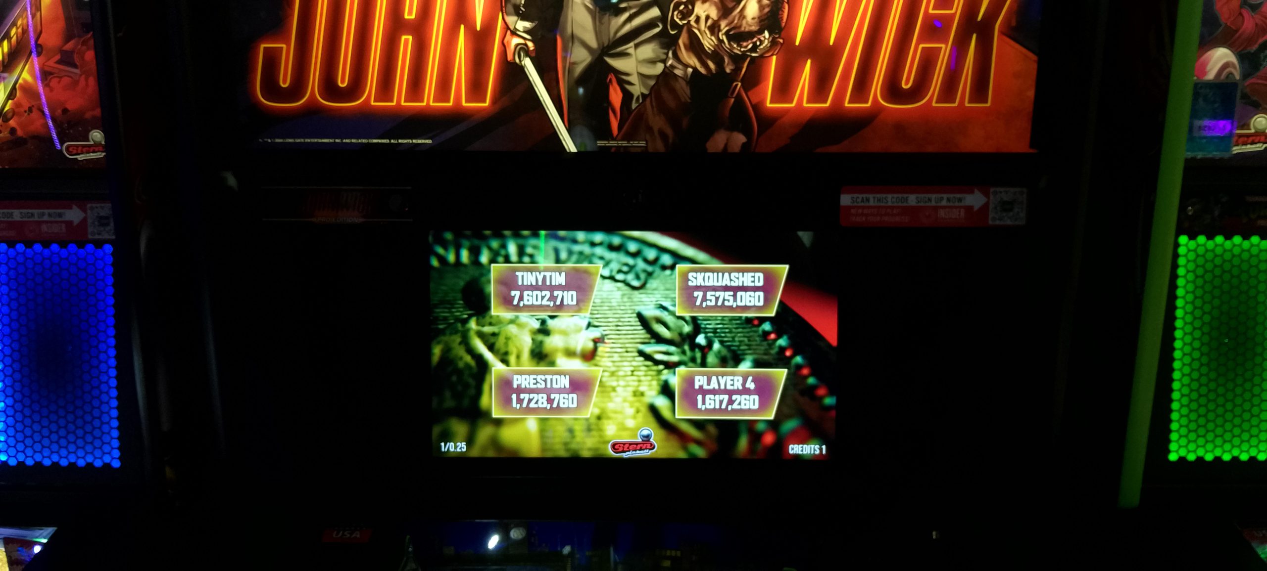 As if that wasn’t enough, apparently I had somehow managed to anger the RNG gods and get assigned to John Wick for the second game as well, this time with Tim Sudela, Preston Moncla, and Johana Mercer. This game was pretty slow all around through the first two balls but I had a nominal lead with 2.1M+ and the remainder of the group under 1.5M+. Tim would shoot ahead with 7.602M+, and I would just miss first place with 7.575M+. Preston would take third with an uncharacteristically low 1.7M+ and Johana would take fourth.